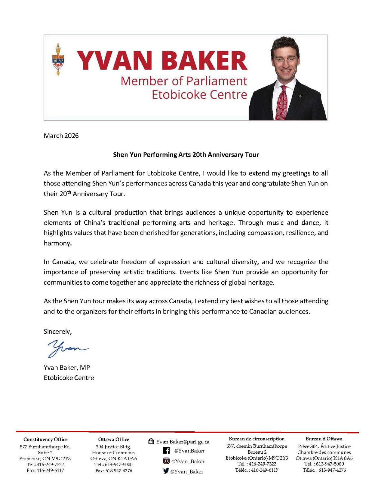 „W Kanadzie celebrujemy wolność wypowiedzi i różnorodność kulturową oraz uznajemy wagę zachowania tradycji artystycznych” – stwierdził poseł Yvan Baker w swoim liście gratulacyjnym. „Wydarzenia takie jak Shen Yun dają społecznościom możliwość spotkania się i docenienia bogactwa światowego dziedzictwa”.