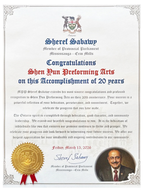 Sheref Sabawy, członek parlamentu prowincji Mississauga-Erin Mills, napisał w swojej proklamacji, że składa szczere gratulacje i wyrazy uznania zespołowi Shen Yun Performing Arts z okazji 20. rocznicy jego istnienia. „Wasz sukces jest dobitnym odzwierciedleniem waszego poświęcenia, wytrwałości i zaangażowania. Razem świętujemy postęp, jaki poczyniliście” – napisał.