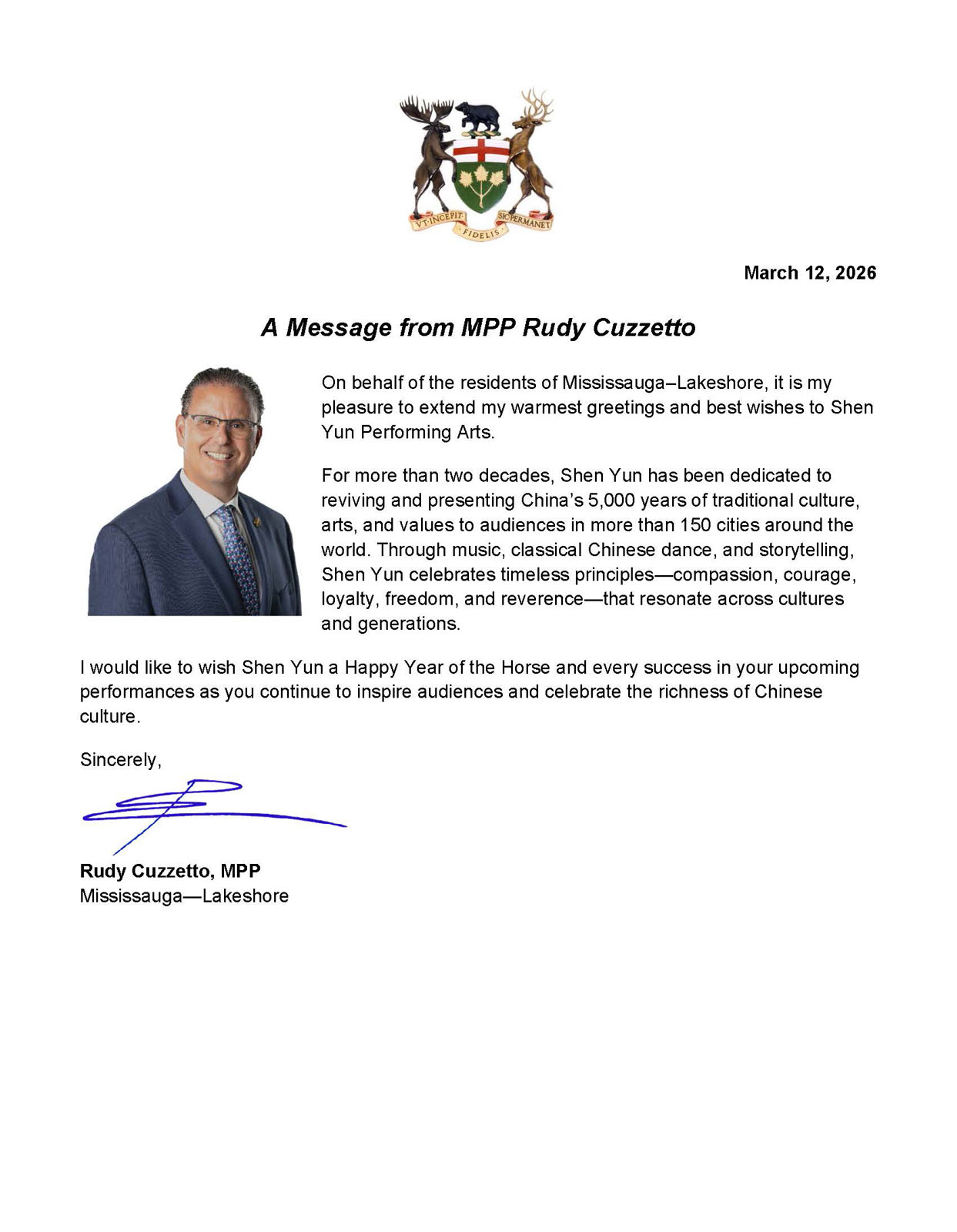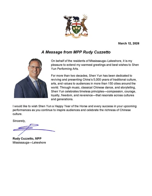Poseł Rudy Cuzzetto z okręgu Mississauga-Lakeshore życzył Shen Yun sukcesów podczas występów w 2026 roku i powiedział, że zespół kontynuuje: „Inspirowanie publiczności i celebrowanie bogactwa chińskiej kultury.
