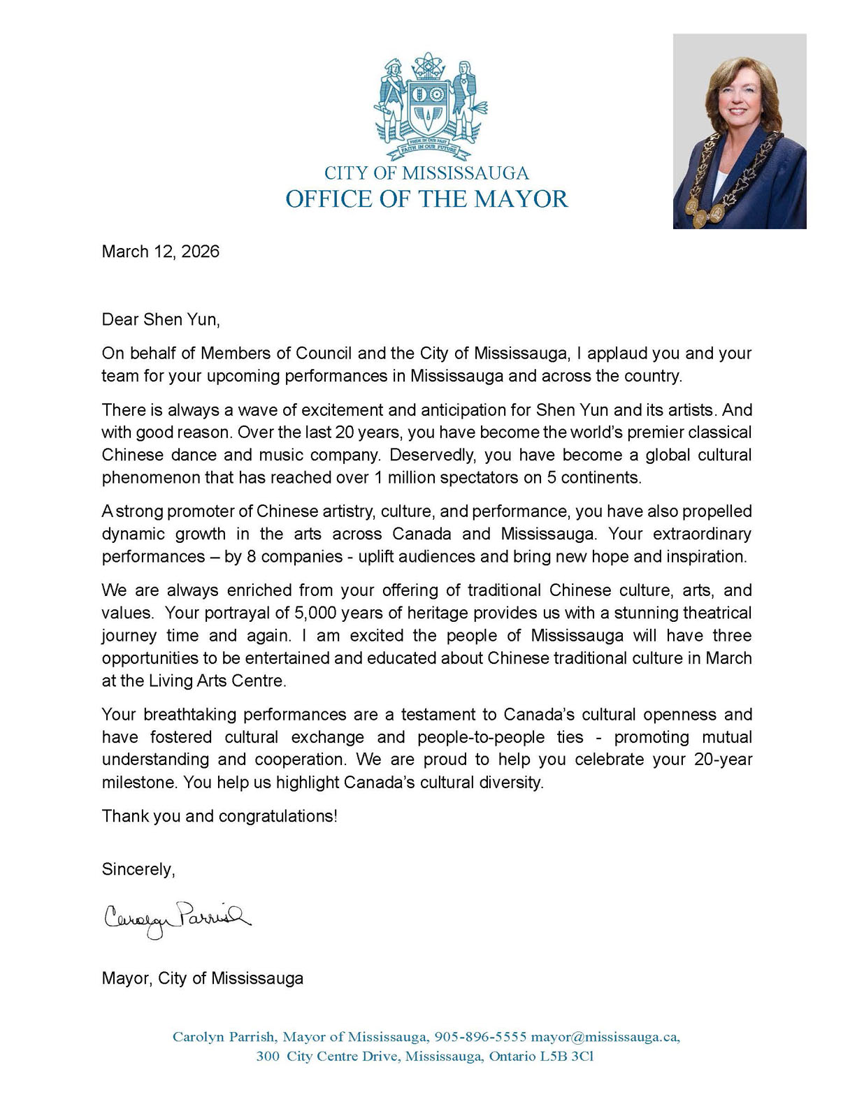 „Jesteście gorącym propagatorem chińskiej sztuki, kultury i sztuki widowiskowej, a także przyczyniliście się do dynamicznego rozwoju sztuki w całej Kanadzie i Mississauga. Wasze niezwykłe występy – w wykonaniu 8 zespołów – podnoszą na duchu publiczność i przynoszą nową nadzieję i inspirację” – kontynuowała w liście. „Wasze przedstawienie 5000 lat dziedzictwa raz po raz zapewnia nam niezwykłą teatralną podróż”.