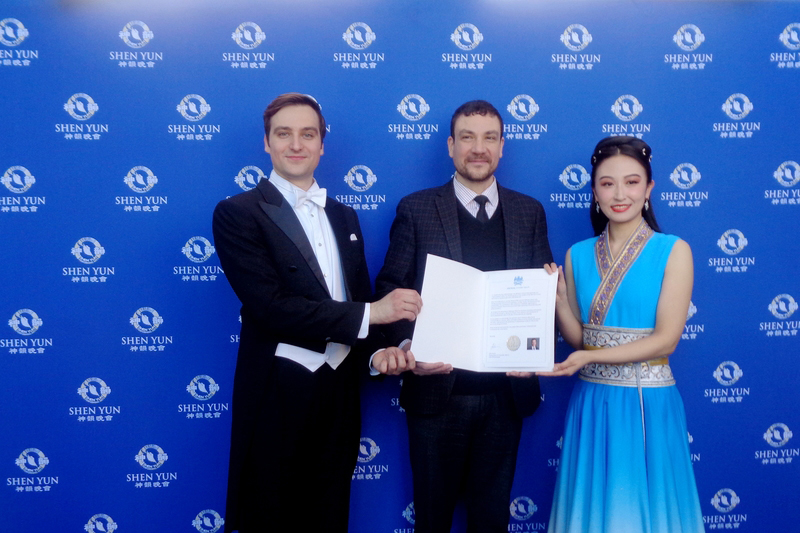 Zastępca burmistrzyni Mississaugi, John Kovac, wręczył list gratulacyjny zespołowi Shen Yun. (The Epoch Times)