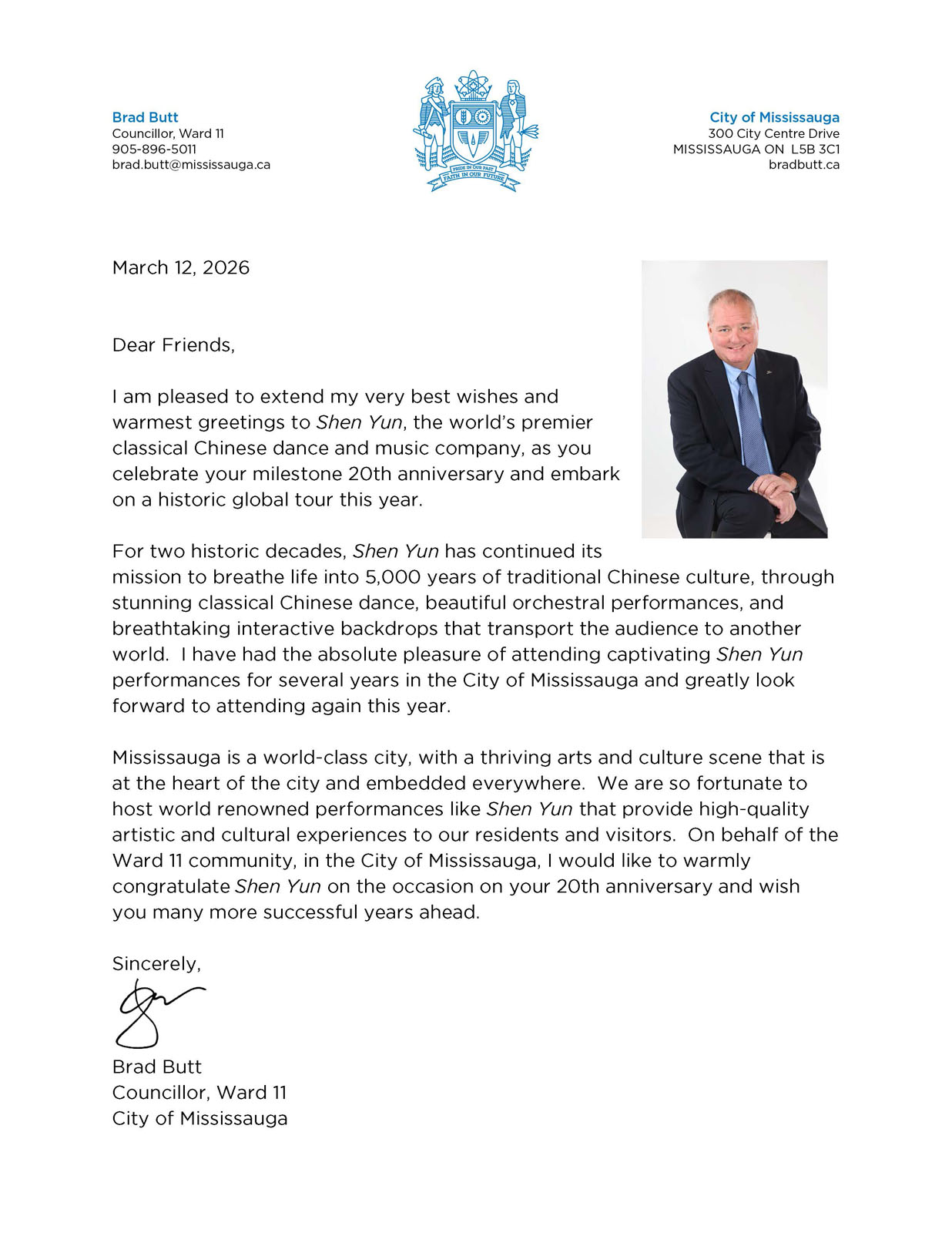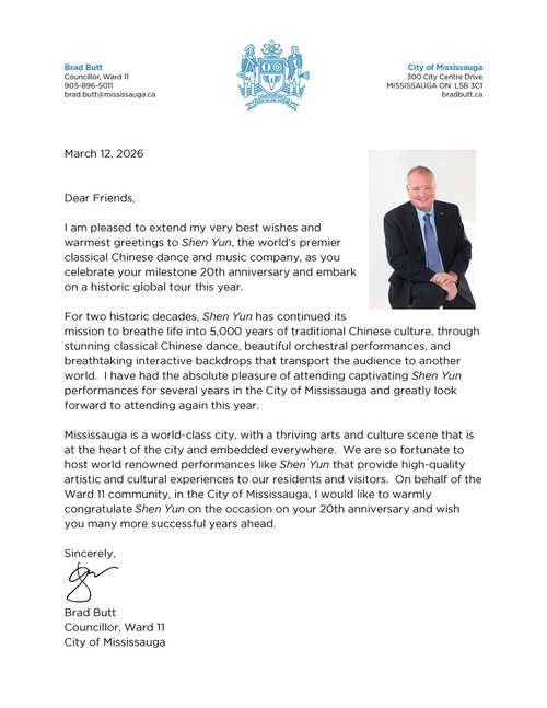 Radny Mississauga, Brad Butt, powiedział, że od kilku lat ma przyjemność uczestniczyć w występach Shen Yun w swoim mieście i z niecierpliwością oczekuje kolejnej wizyty w tym roku.