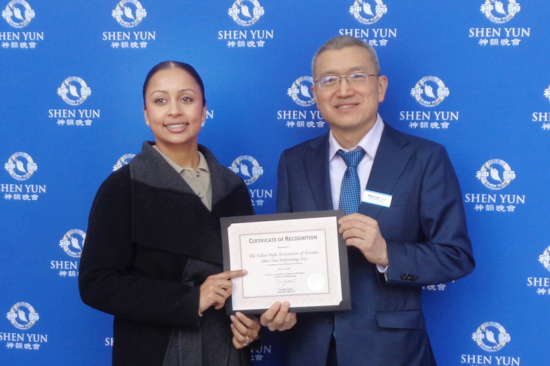 Asystentka Sue McFadden, radnej okręgu 10 Mississauga, przybyła tego dnia do teatru, aby wygłosić proklamację w imieniu radnej i miasta Mississauga, gratulując Shen Yun 20-lecia istnienia.