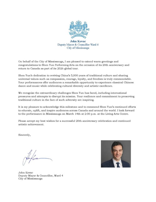 Zastępca burmistrza i radny Mississaugi, John Kovac, powiedział, że wytrwałość i zaangażowanie Shen Yun w zachowanie tradycyjnej kultury w obliczu presji międzynarodowej i prób zakłócenia jej misji są „inspirujące”.