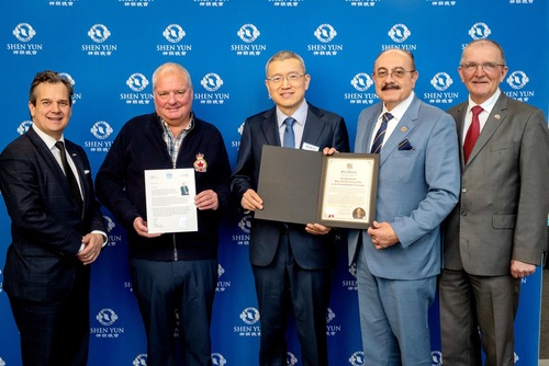 Po południu 14 marca 2026 roku poseł prowincjonalny prowincji Ontario, Sheref Sabawy (drugi od prawej), wręczył nagrodę Shen Yun w teatrze i obejrzał występ. Pozostali urzędnicy na zdjęciu to: radny miasta Mississauga Stephen Dasko (pierwszy od lewej), radny miasta Mississauga Brad Butt (drugi od lewej) i były poseł Władysław Lizon (pierwszy od prawej). (The Epoch Times)