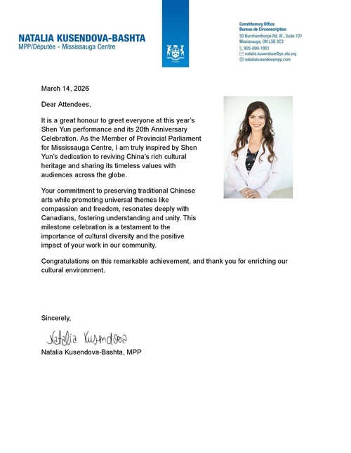 W liście gratulacyjnym posłanka prowincji Ontario, Natalia Kusendova-Bashta, napisała: „Jestem głęboko poruszona i zainspirowana staraniami Shen Yun, by ożywić długoletnie dziedzictwo kulturowe Chin i przekazać jego niezmienne wartości globalnej publiczności”.