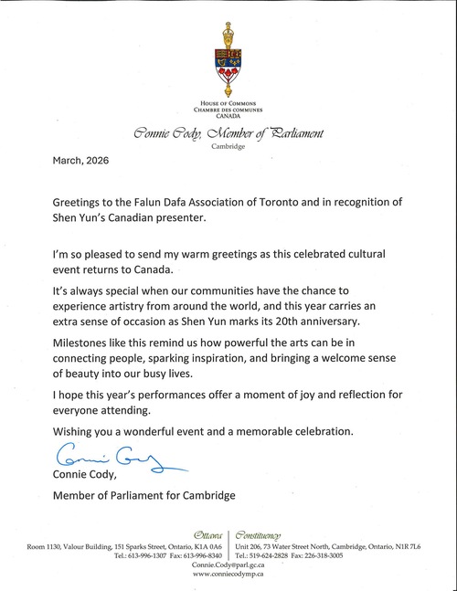 (Minghui.org) Światowej sławy Shen Yun Performing Arts przybył do Kanady 12 marca 2026 roku na trasę koncertową obejmującą 21 koncertów, która rozpoczęła się w Hamilton w Ontario. Przed występami wybrani urzędnicy różnych szczebli wydali proklamacje lub wysłali listy gratulacyjne z okazji powrotu Shen Yun do Kanady. Pogratulowali Shen Yun 20. rocznicy i życzyli zespołowi wielu sukcesów. W pokazach uczestniczyło wielu przedstawicieli władz, którzy wygłosili proklamacje.