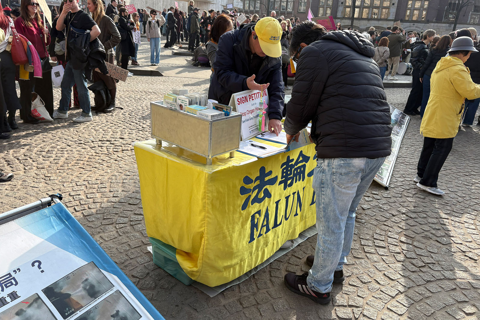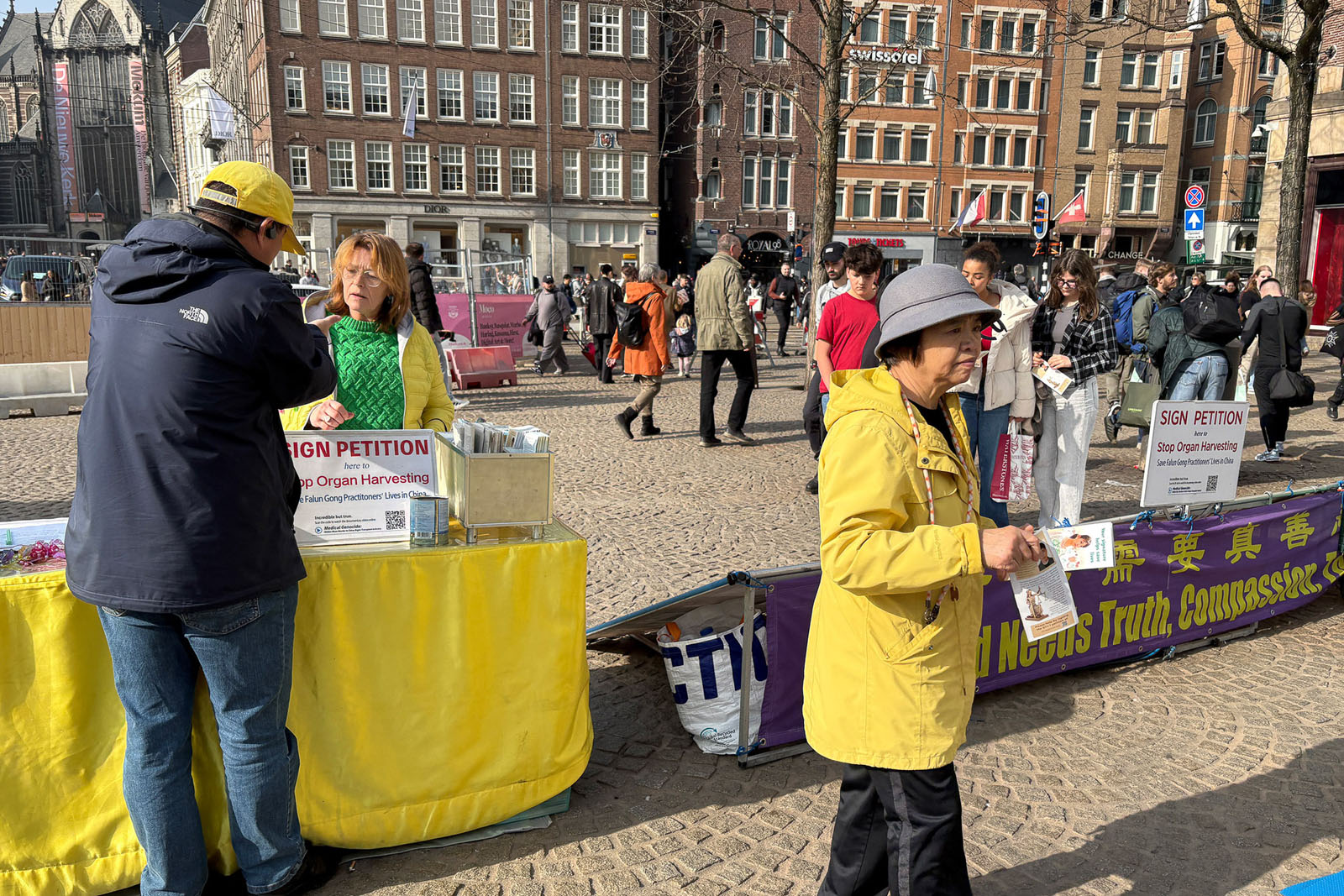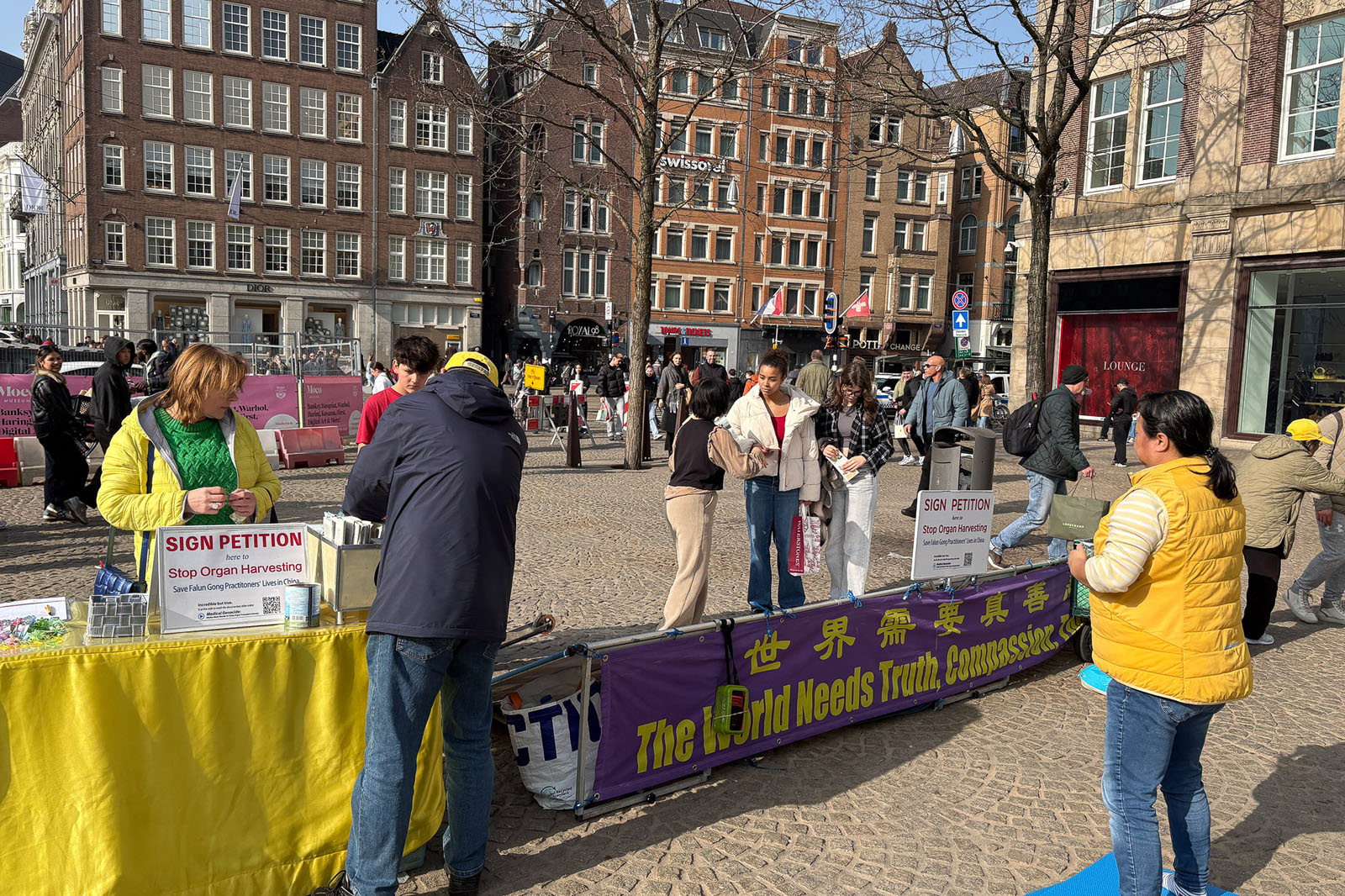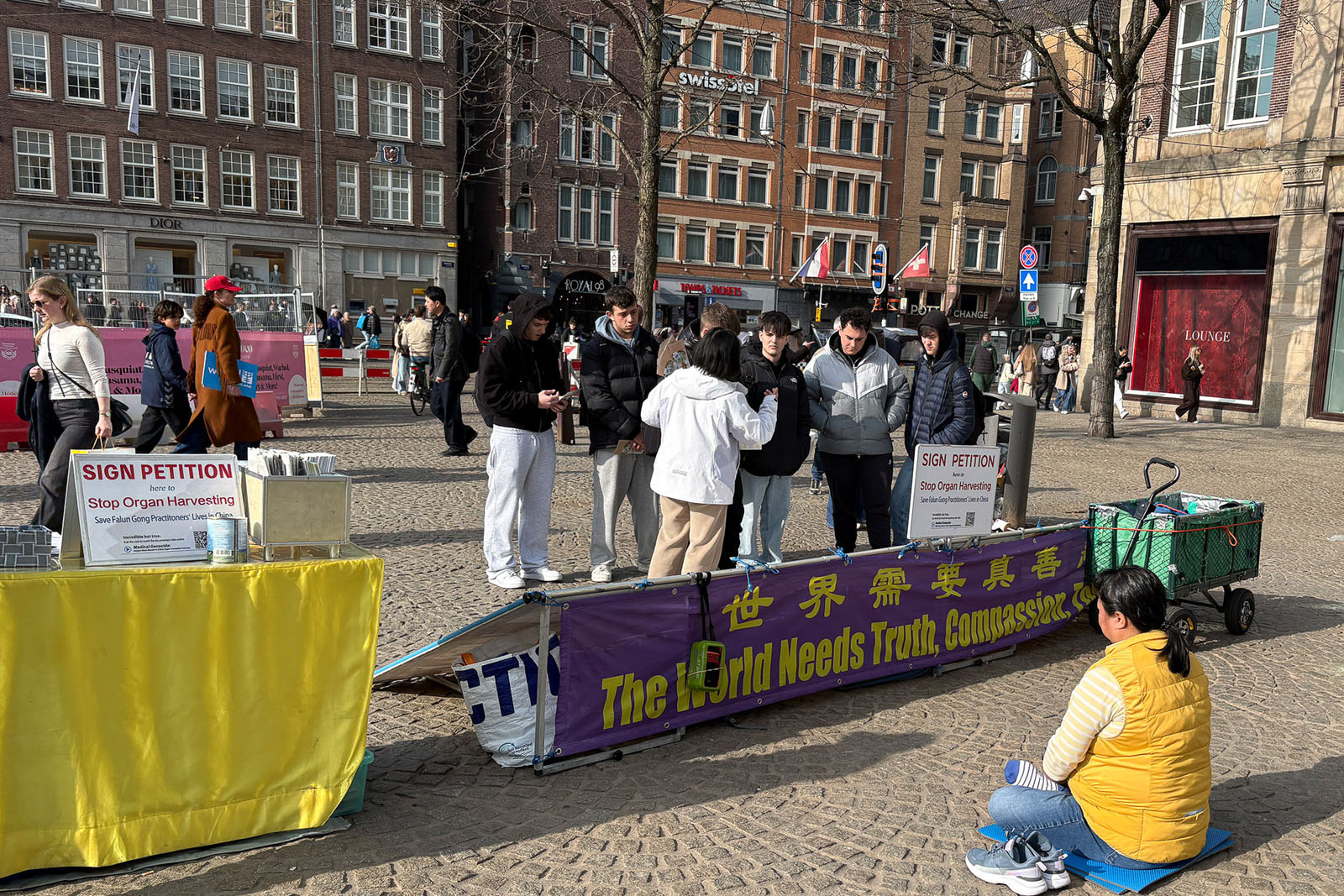 Praktykujący zbierali podpisy pod petycją wzywającą państwa G7+7 do podjęcia działań mających na celu powstrzymanie sankcjonowanego przez państwo grabieży organów przez KPCh. Wielu turystów zatrzymało się, aby przeczytać tablice informacyjne i podpisać petycję.