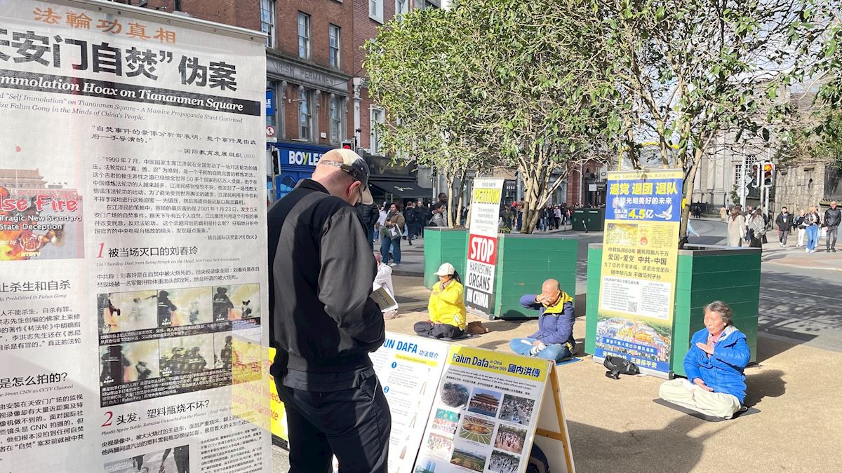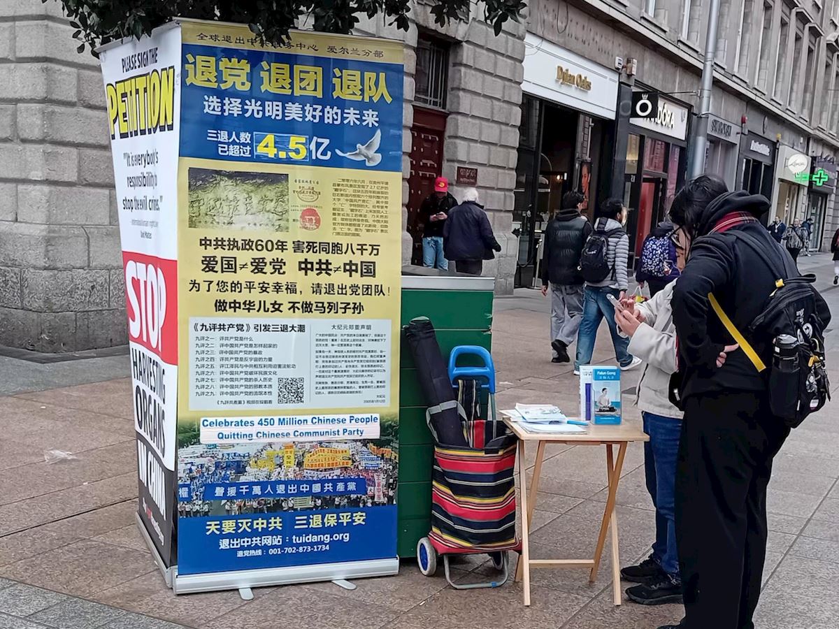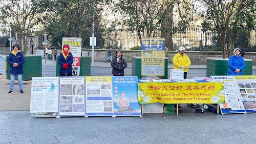 (Minghui.org) Praktykujący Falun Dafa w Irlandii w każdy weekend marca 2026 roku organizowali w Dublinie zajęcia promujące Falun Dafa. Podnosili również świadomość na temat prześladowań Dafa przez Komunistyczną Partię Chin (KPCh), które trwają nieprzerwanie od lipca 1999 roku. Wraz z napływem chińskich studentów, imigrantów i turystów, praktykujący w ciągu tygodnia utworzyli punkt informacyjny. Wielu Chińczyków skorzystało z okazji, aby wystąpić z KPCh i powiązanych z nią organizacji młodzieżowych.