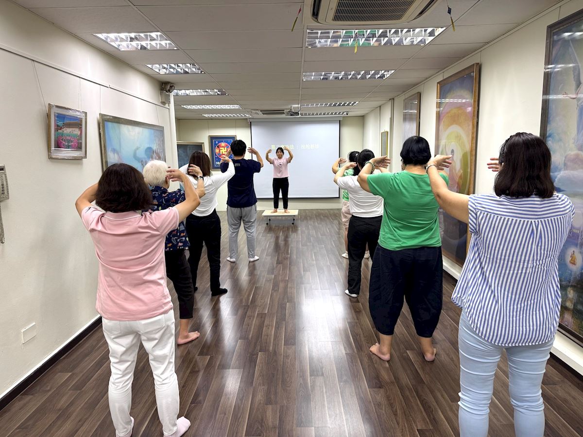 Uczestnicy uczą się ćwiczeń Falun Dafa