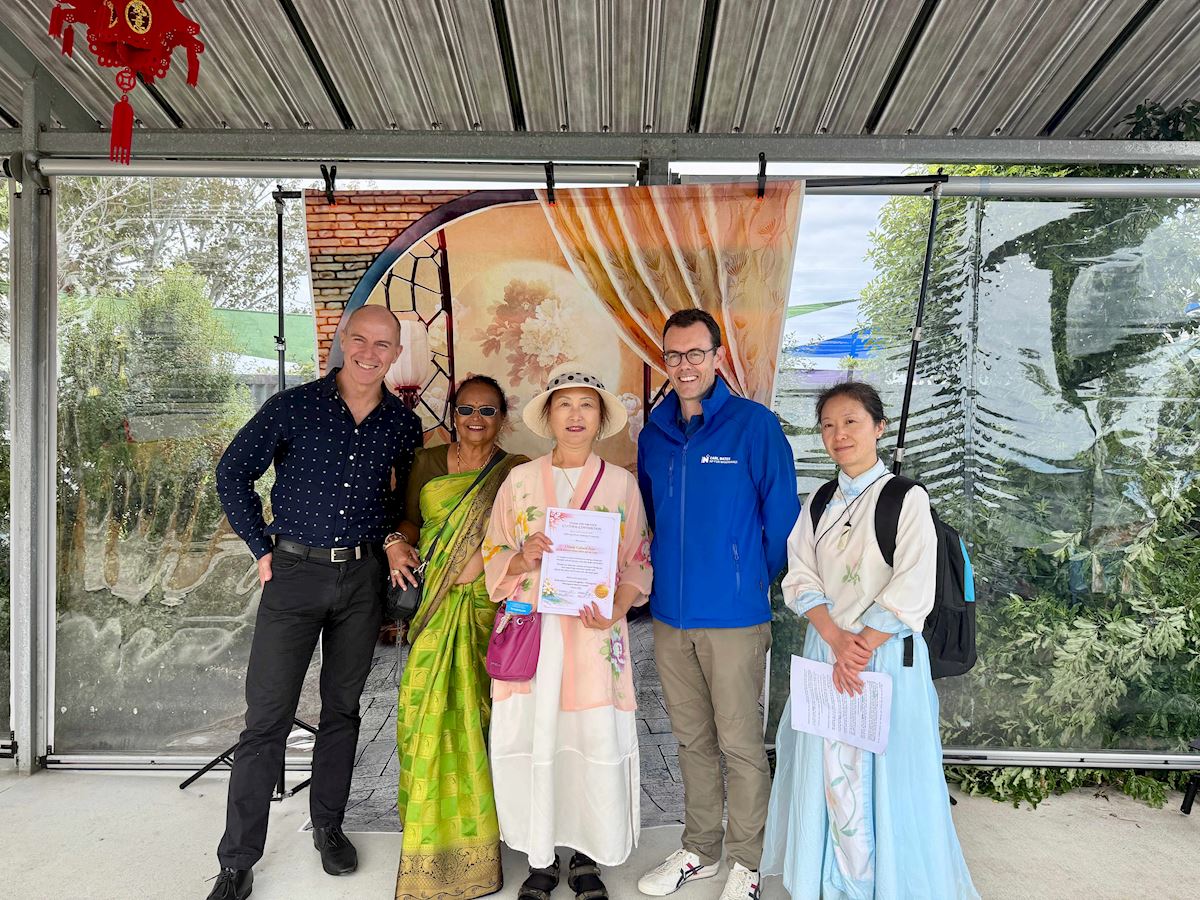 Pushpa Prasad (po lewej), przewodnicząca Rady Wielokulturowej, Carl Bates, poseł do parlamentu (drugi od lewej) i burmistrz Andrew Tripe (w środku) wręczają certyfikat uznania praktykującym Falun Dafa za udział w inauguracyjnym Festiwalu Azji i Pacyfiku w Whanganui