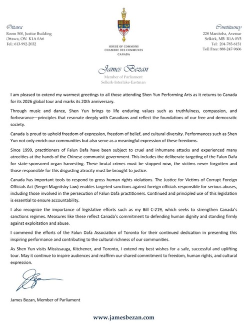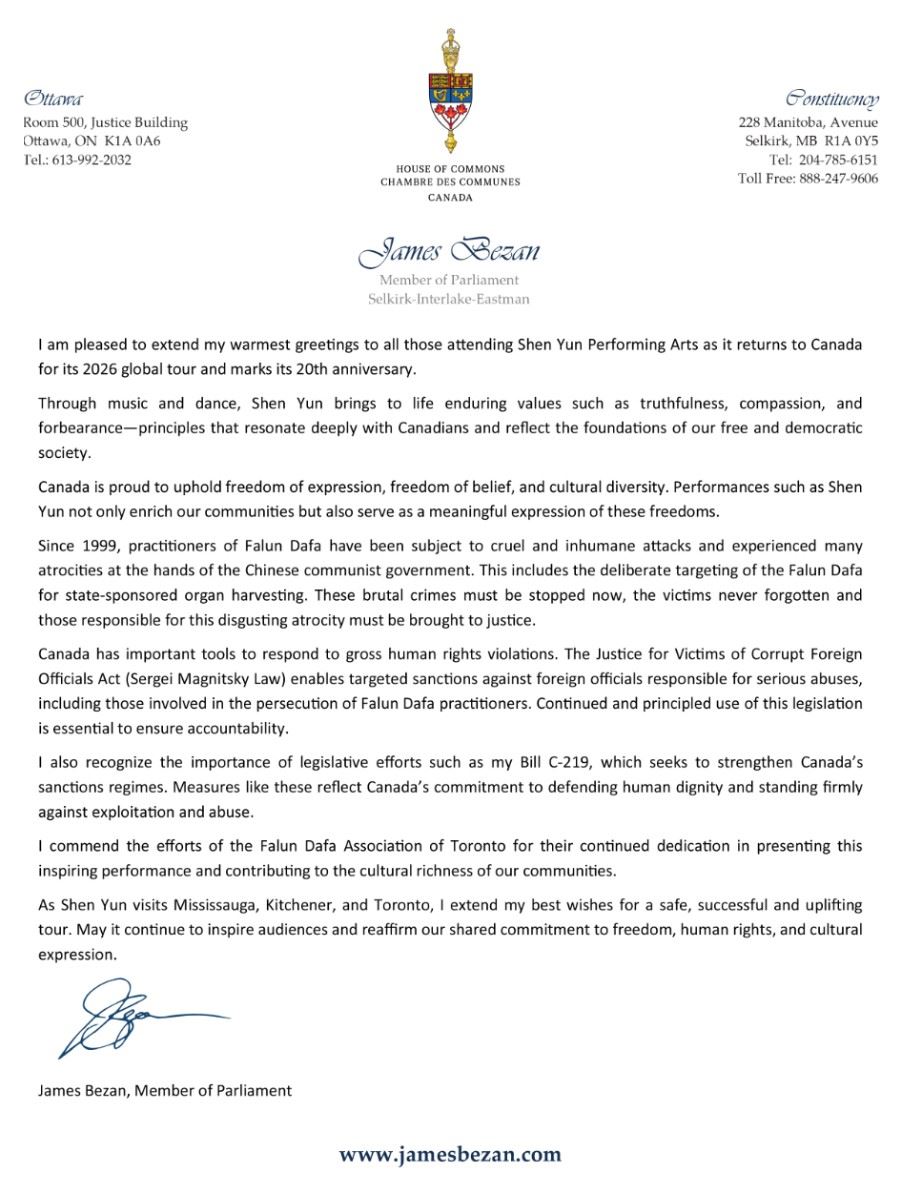James Bezan, poseł z Manitoby, napisał: „Z radością kieruję najserdeczniejsze pozdrowienia do wszystkich widzów Shen Yun Performing Arts, które powracają do Kanady w ramach światowej trasy występów w 2026 roku i świętują swoją 20. rocznicę.