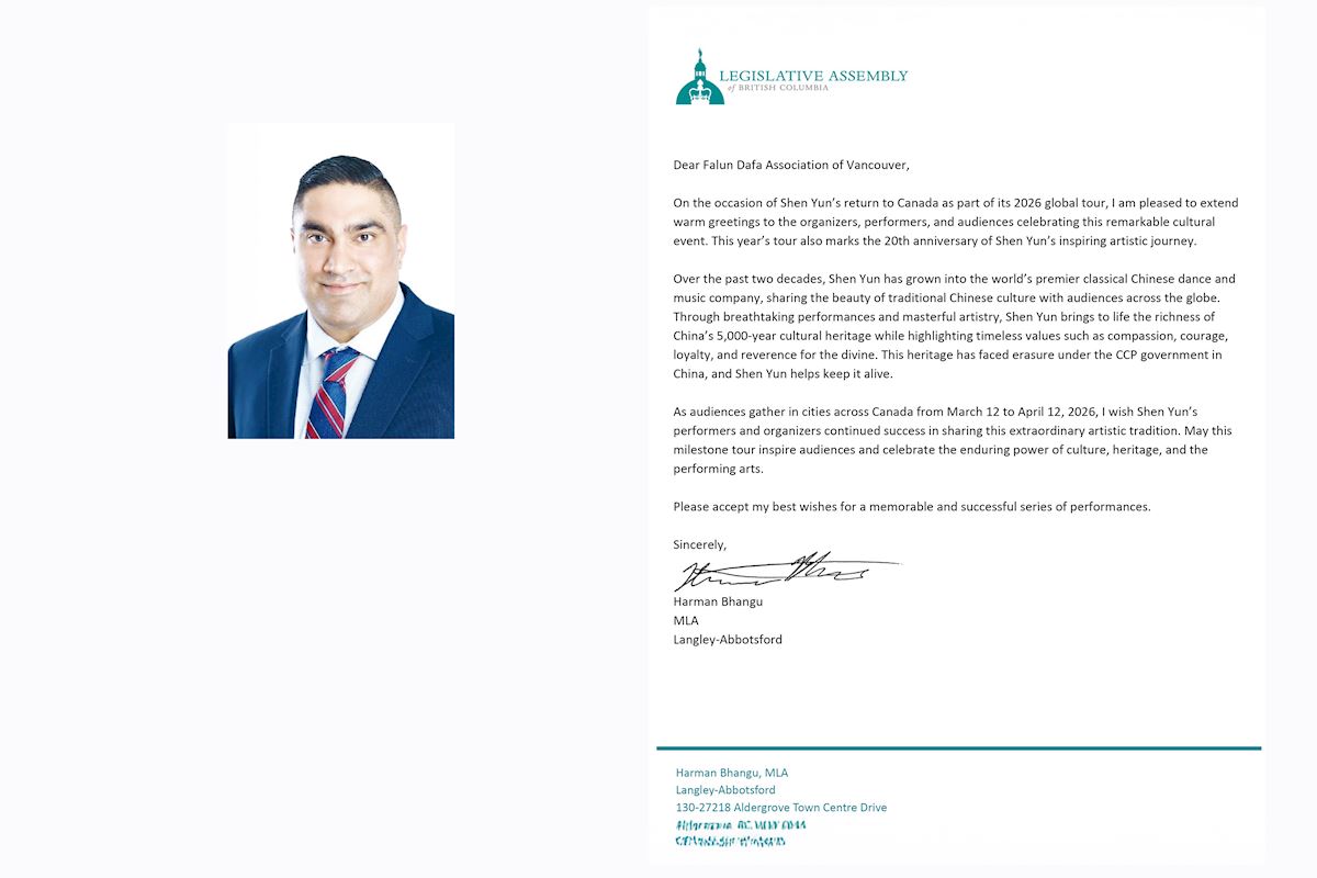 Harman Bhangu, członek Zgromadzenia Ustawodawczego (MLA) Kolumbii Brytyjskiej, napisał: „W ciągu ostatnich dwóch dekad Shen Yun stał się czołowym na świecie zespołem zajmującym się klasycznym chińskim tańcem i muzyką, dzieląc się pięknem tradycyjnej kultury chińskiej z widzami na całym świecie. Dzięki zapierającym dech w piersiach występom i mistrzowskiej sztuce Shen Yun ożywia bogactwo 5000-letniego dziedzictwa kulturowego Chin, podkreślając jednocześnie ponadczasowe wartości, takie jak współczucie, odwaga, lojalność i szacunek dla boskości. Dziedzictwo to stanęło w obliczu zaniku pod rządami KPCh w Chinach, a Shen Yun pomaga je utrzymać przy życiu”.