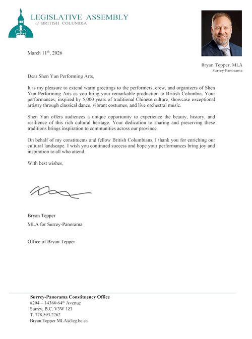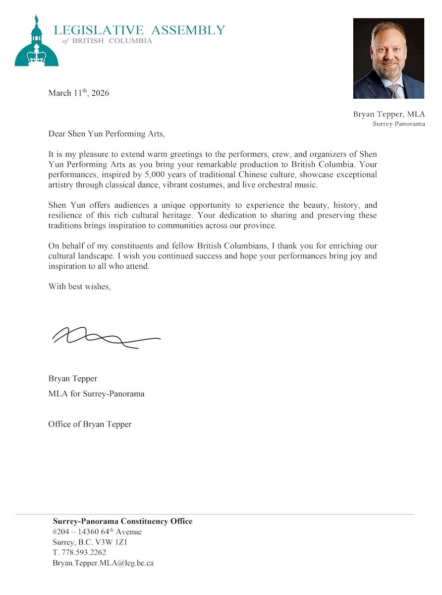 Bryan Tepper, członek zgromadzenia ustawodawczego prowincji Kolumbia Brytyjska, napisał: „Z wielką przyjemnością kieruję serdeczne pozdrowienia do artystów, ekipy i organizatorów Shen Yun Performing Arts z okazji przybycia waszego niezwykłego spektaklu do Kolumbii Brytyjskiej. Wasze przedstawienia, inspirowane 5000 latami tradycyjnej kultury chińskiej, prezentują wyjątkowy kunszt artystyczny poprzez taniec klasyczny, barwne kostiumy i muzykę orkiestry na żywo.