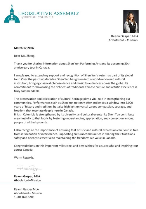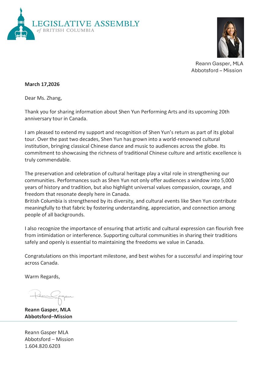 Reanne Gasper, posłanka do parlamentu prowincji Kolumbia Brytyjska, napisała: „W ciągu ostatnich dwóch dekad Shen Yun stało się znaną na całym świecie instytucją kulturalną, prezentującą klasyczny chiński taniec i muzykę widzom na całym świecie. Jego zaangażowanie w ukazywanie bogactwa tradycyjnej kultury chińskiej oraz artystycznej doskonałości jest naprawdę godne pochwały”.
