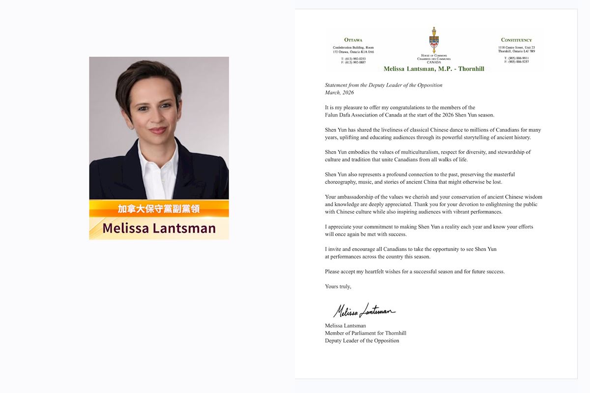 Posłanka Melissa Lantsman, wiceprzewodnicząca opozycji, napisała: „Od wielu lat Shen Yun dzieli się z milionami Kanadyjczyków żywiołowością klasycznego chińskiego tańca, podnosząc na duchu i edukując widzów poprzez poruszające opowieści o starożytnej historii”.
