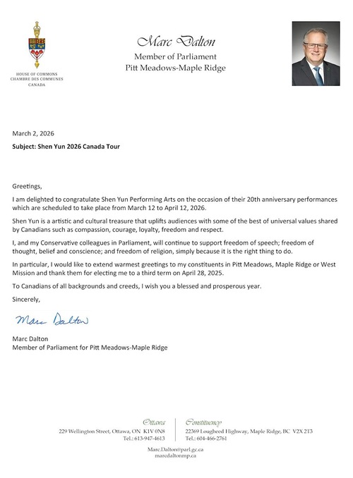Marc Dalton, poseł z okręgu Pitt Meadows-Maple Ridge, napisał: „Shen Yun to skarb sztuki i kultury, który podnosi na duchu widzów, prezentując jedne z najwspanialszych uniwersalnych wartości wyznawanych przez Kanadyjczyków, takich jak współczucie, odwaga, lojalność, wolność i szacunek”.