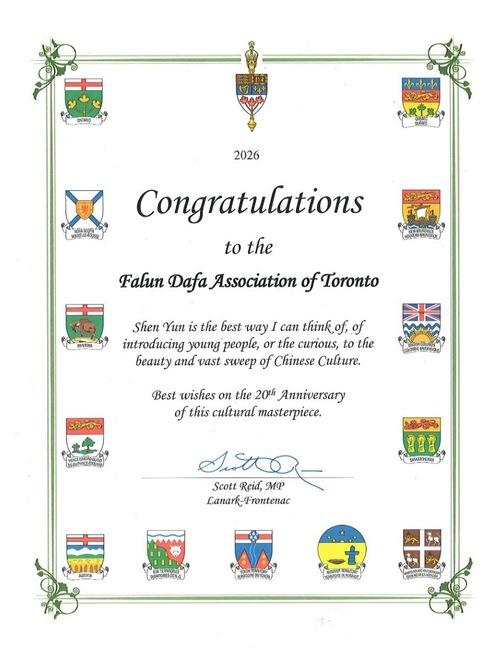 Konserwatywny poseł Costas Menegakis, reprezentujący okręg Aurora-Oak Ridges-Richmond Hill, wręczył Shen Yun proklamację i zauważył, że ta grupa artystyczna „zainspirowała widzów na całym świecie poprzez klasyczny chiński taniec i muzykę, dzieląc się bogactwem tradycyjnej kultury, artystyczną doskonałością i ponadczasowymi wartościami”.