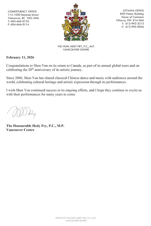 Hedy Fry, posłanka z okręgu Vancouver Centre, napisała: „Gratuluję zespołowi Shen Yun powrotu do Kanady w ramach corocznych światowych tras koncertowych oraz z okazji 20. rocznicy jego artystycznej działalności.