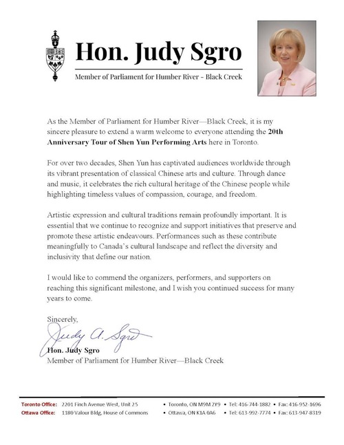Pani Sgro napisała: „Od ponad dwóch dekad Shen Yun zachwyca widzów na całym świecie dzięki pełnym życia prezentacjom klasycznej chińskiej sztuki i kultury. Poprzez taniec i muzykę grupa ta celebruje bogate dziedzictwo kulturowe Chińczyków, podkreślając jednocześnie ponadczasowe wartości, takie jak współczucie, odwaga i wolność”.