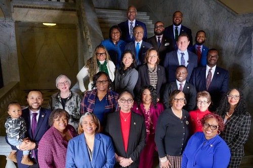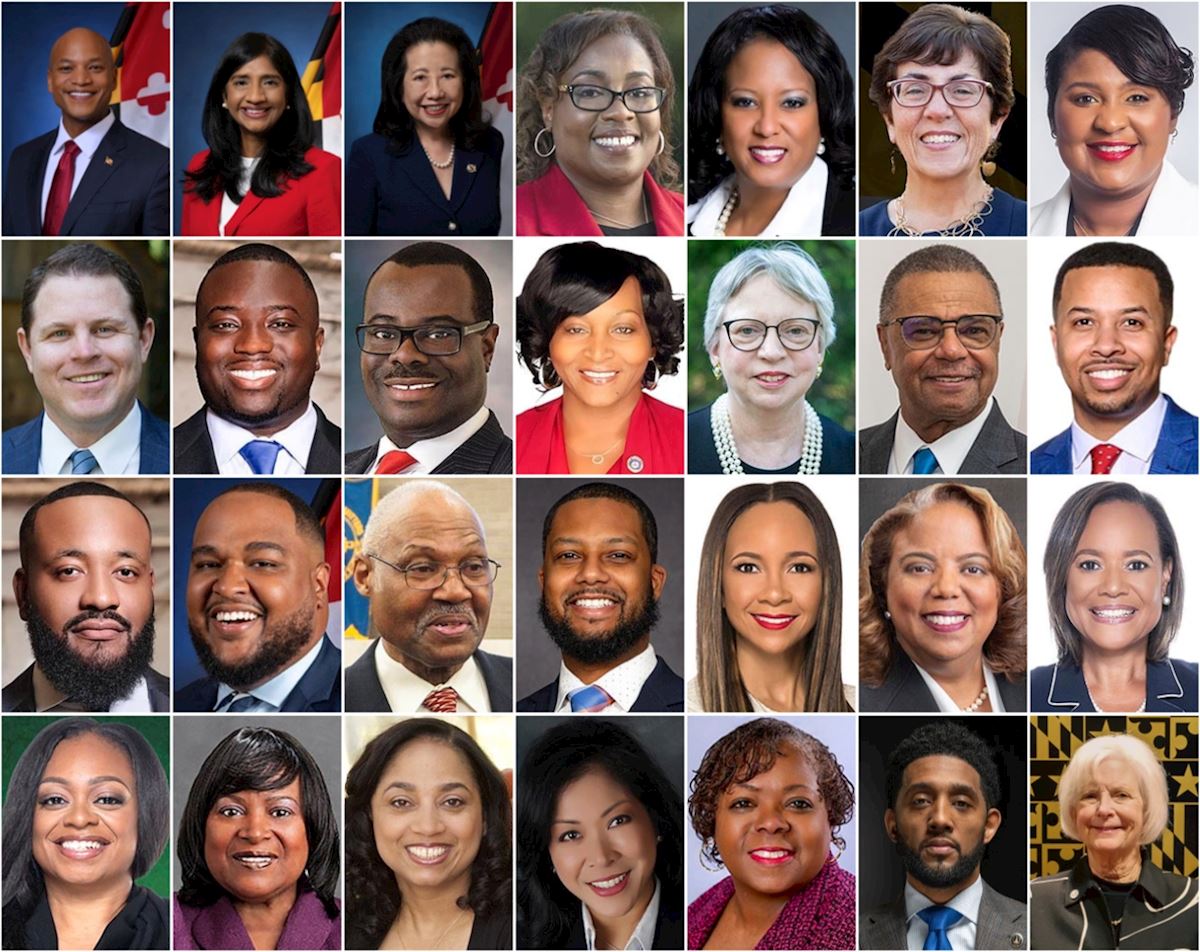 Górny rząd, od lewej do prawej: Wes Moore, gubernator Maryland; Aruna Miller, wicegubernator Maryland; Susan C. Lee, sekretarz stanu Maryland; oraz delegaci stanu Maryland: Nicole A. Williams, Andrea Fletcher Harrison, Mary A. Lehman i Tiffany T. Alston.