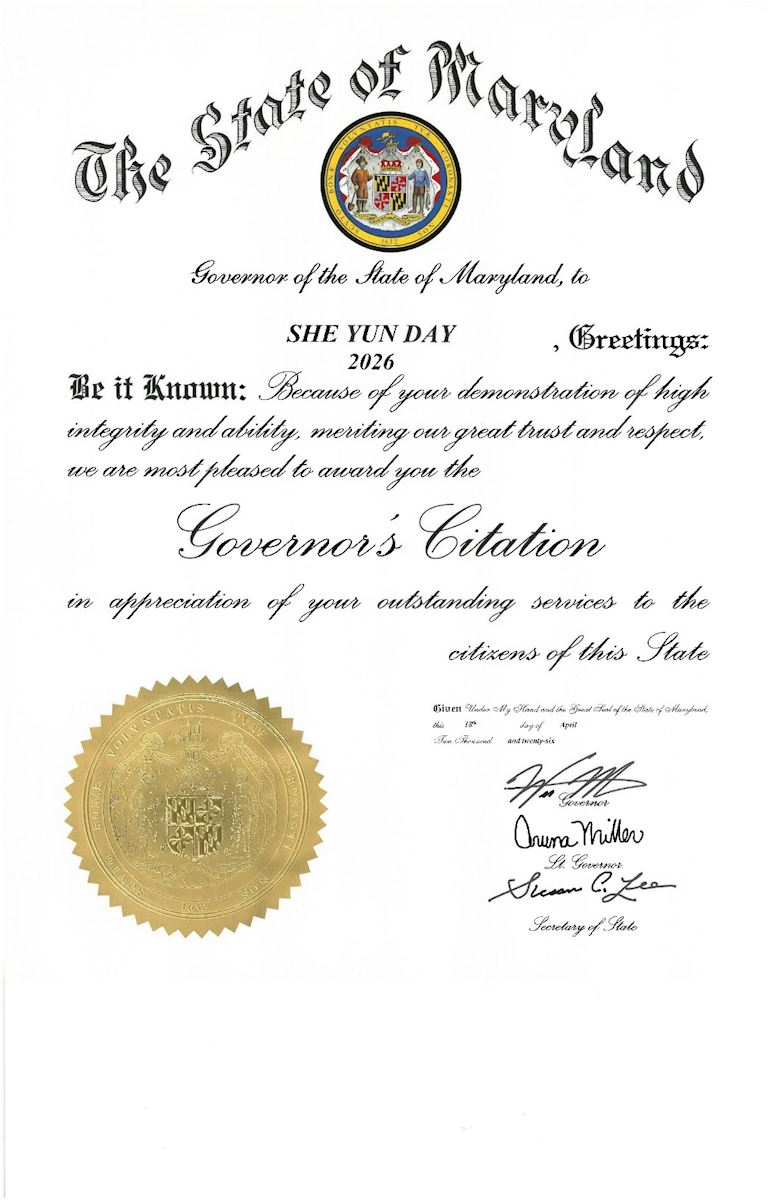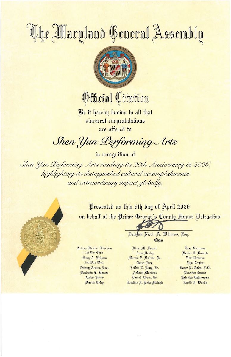 Pochwała datowana jest na 18 kwietnia, dzień pierwszego występu Shen Yun w Baltimore. Podpisali ją również wicegubernator Aruna Miller i sekretarz stanu Susan C. Lee.
