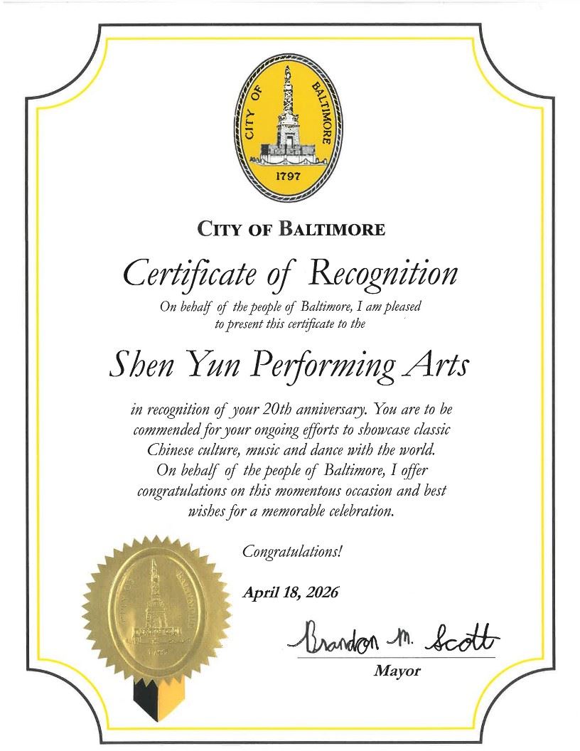 Burmistrz Brandon M. Scott napisał: „W imieniu mieszkańców Baltimore z przyjemnością wręczam ten certyfikat zespołowi Shen Yun Performing Arts z okazji 20. rocznicy. Należy Wam się uznanie za nieustające wysiłki na rzecz zaprezentowania klasycznej chińskiej kultury, muzyki i tańca całemu światu. W imieniu mieszkańców Baltimore składam gratulacje z okazji tej doniosłej okazji i życzę niezapomnianych obchodów”.