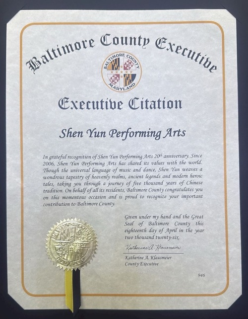 Katherine A. Klausmeier, Starosta Hrabstwa Baltimore, napisała: „W dowód wdzięczności z okazji 20. rocznicy istnienia Shen Yun Performing Arts. Od 2006 roku Shen Yun Performing Arts dzieli się swoimi wartościami ze światem. Poprzez uniwersalny język muzyki i tańca, Shen Yun tka cudowną mozaikę niebiańskich krain, starożytnych legend i współczesnych opowieści bohaterskich, zabierając Was w podróż trwającą pięć tysięcy lat chińskiej tradycji. W imieniu wszystkich mieszkańców hrabstwa Baltimore składamy Wam gratulacje z okazji tej doniosłej okazji i z dumą doceniamy Wasz istotny wkład w rozwój hrabstwa Baltimore”.