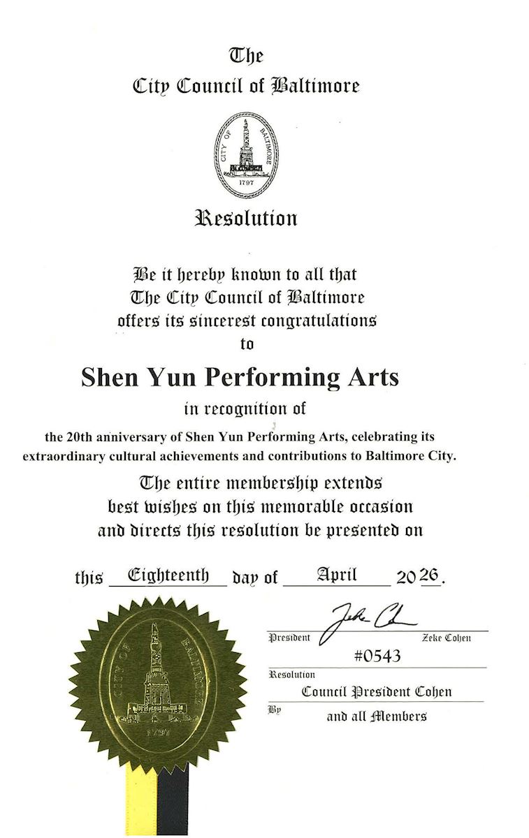 (Minghui.org) W związku z planowanym występem zespołu Shen Yun Performing Arts na scenie teatru Hippodrome w dniach 18–19 kwietnia 2026 r. Rada Miasta Baltimore przyjęła uchwałę, w której doceniła „wyjątkowe osiągnięcia kulturalne i wkład w rozwój miasta Baltimore”.