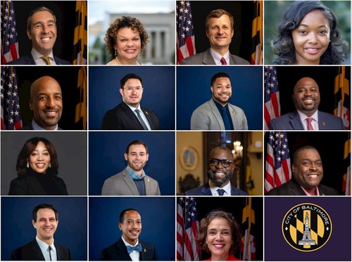 (Od lewej do prawej, od 1. do 4. rzędu) Przewodniczący Rady Miasta Baltimore Zeke Cohen; wiceprzewodnicząca Sharon Green; członkowie Rady Miasta: Mark Parker, Danielle McCray, Mark Conway, Isaac „Yitzy” Schleifer, James Torrence, Paris Gray, Phylicia Porter, Zac Blanchard, Jermaine Jones, Antonio Glover, Ryan Dorsey, John T. Bullock i Odette Ramos