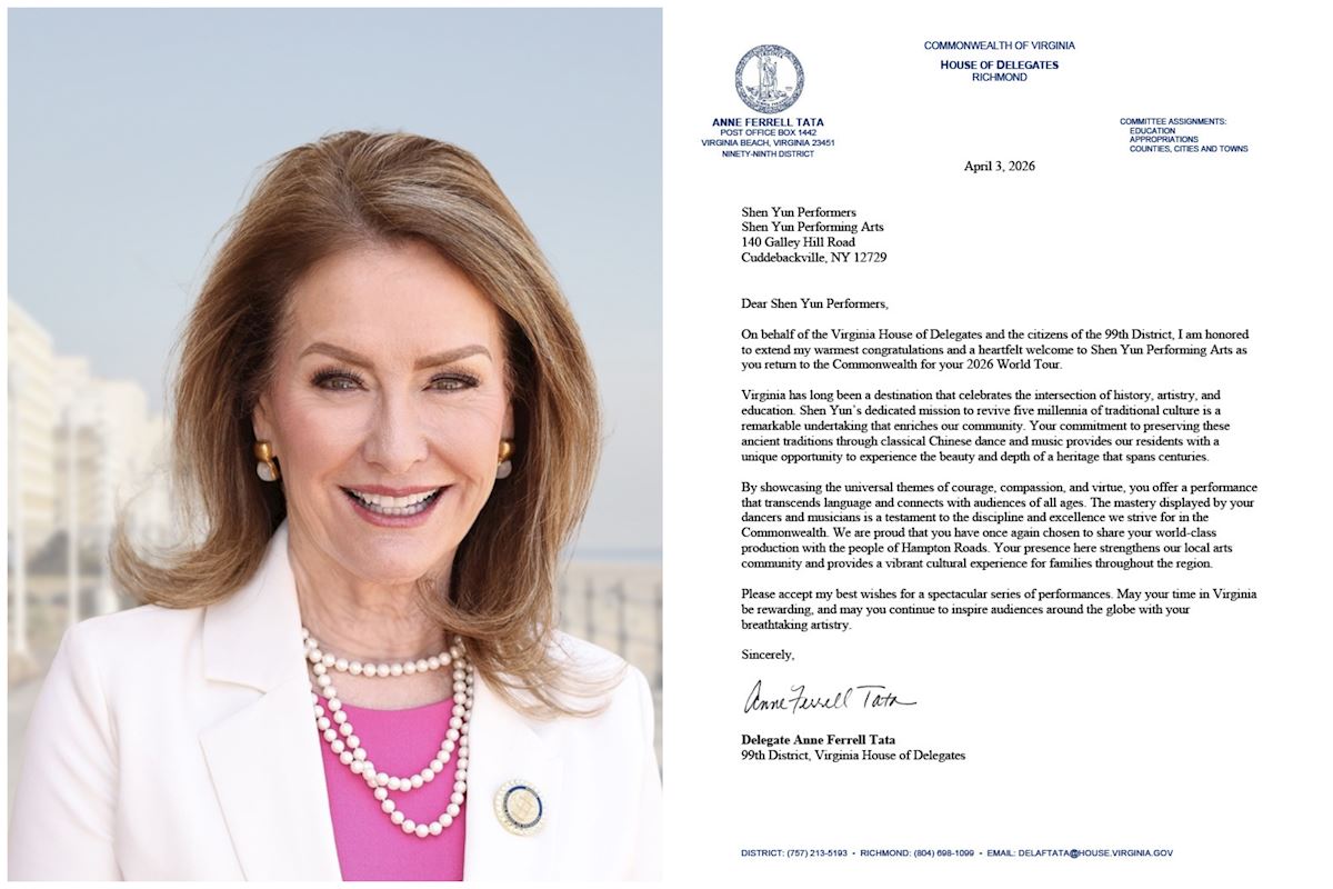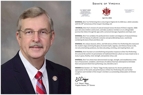 „W imieniu własnym i Senatu Wirginii składam najszczersze gratulacje całej rodzinie Shen Yun Performing Arts. Życzę Wam, abyście przez wiele lat nadal edukowali, wzbogacali i inspirowali publiczność na całym świecie”.