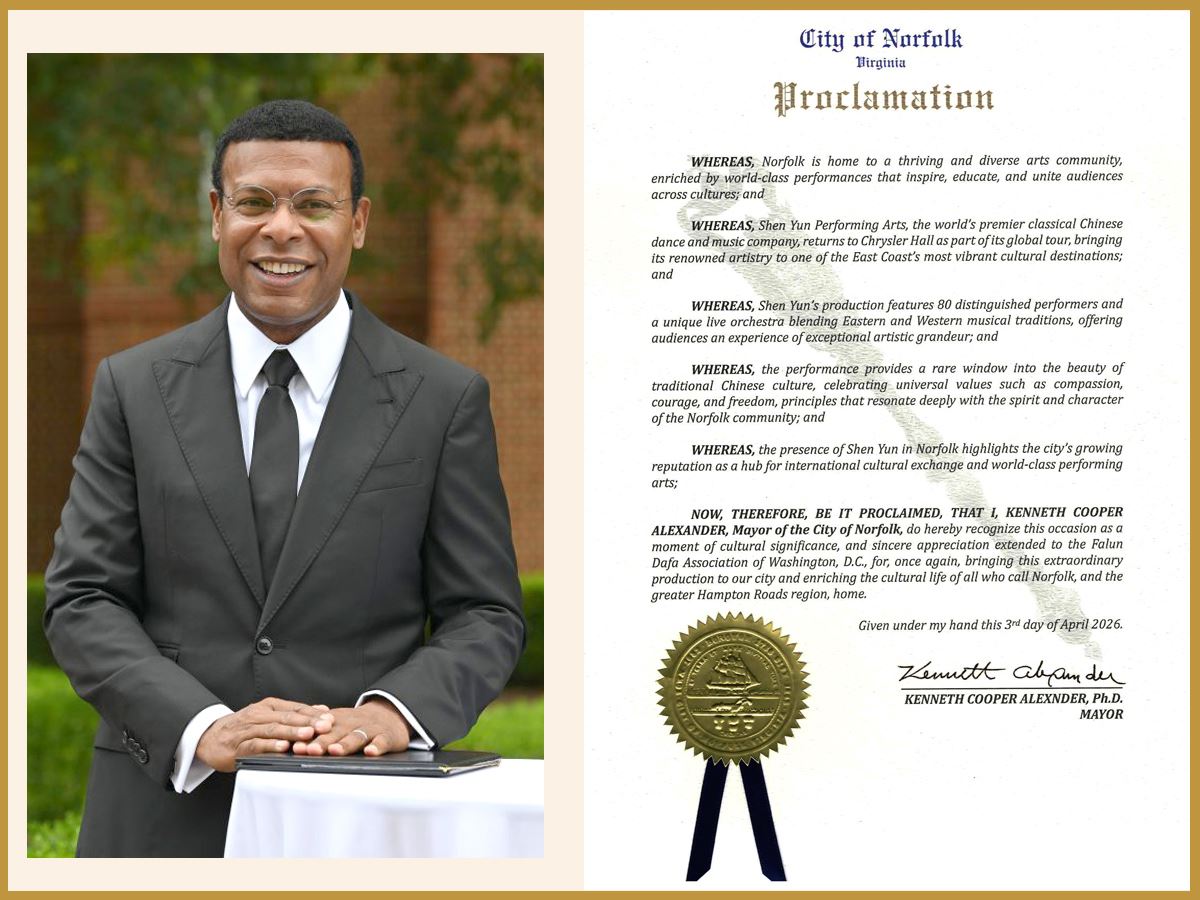 „ZATEM OGŁASZAMY, ŻE JA, KENNETH COOPER ALEXANDER, Burmistrz Miasta Norfolk, niniejszym uznaję tę okazję za moment o znaczeniu kulturowym i składam szczere wyrazy uznania Stowarzyszeniu Falun Dafa z Waszyngtonu za ponowne zorganizowanie tej niezwykłej produkcji w naszym mieście i wzbogacenie życia kulturalnego wszystkich, którzy nazywają Norfolk i region Hampton Roads swoim domem”.