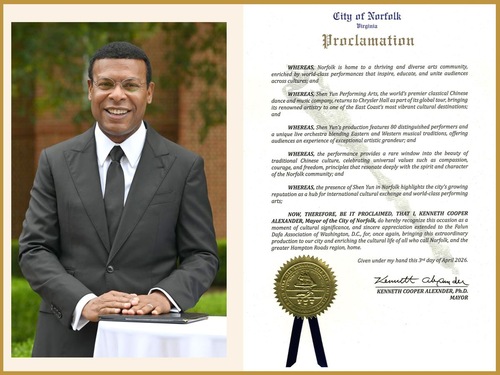 (Minghui.org) Przed występami Shen Yun w Chrysler Hall w Norfolk w stanie Wirginia, 22 i 23 kwietnia 2026 roku, zespół otrzymał uznanie od przedstawicieli władz federalnych, stanowych i miejskich.