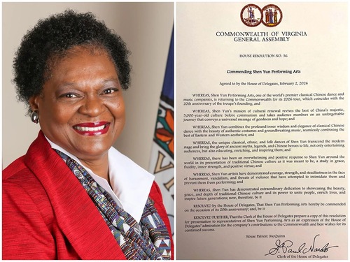 Izba Delegatów Wirginii przyjęła Rezolucję Izby nr 36, „Pochwalenie Shen Yun Performing Arts”. Patronem Izby w tej Rezolucji była delegatka Delores L. McQuinn. Z przyjemnością oglądała Shen Yun i planuje ponownie obejrzeć Shen Yun z dwiema wnuczkami w Norfolk.