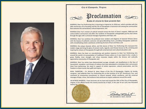„ZATEM, ja, dr Richard W. West, burmistrz miasta Chesapeake w stanie Wirginia, niniejszym uznaję i oddaję hołd zespołowi Shen Yun Performing Arts z okazji jego 20. trasy koncertowej, a także wyrażam uznanie za jego niezachwiane zaangażowanie w odnowę kulturową, doskonałość artystyczną oraz uniwersalne przesłanie nadziei, cnoty i wytrwałości, które wciąż inspiruje publiczność na całym świecie”.
