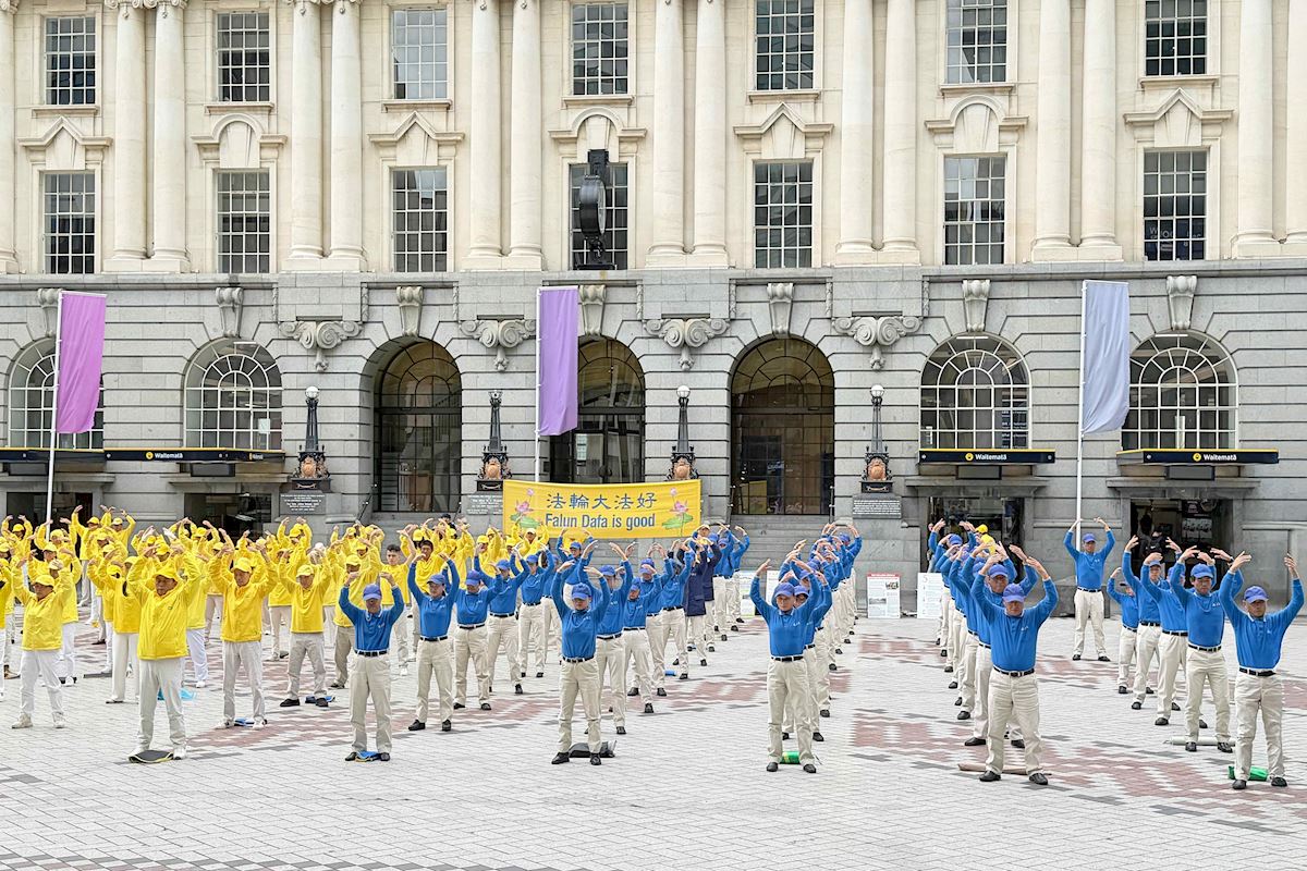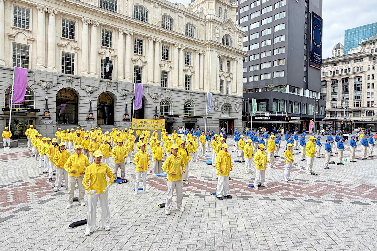 (Minghui.org) Wiele osób zatrzymało się, aby obejrzeć spokojne ćwiczenia grupowe w Commercial Bay w centrum Auckland, 18 kwietnia 2026 roku. Praktykujący Falun Gong (Falun Dafa) zorganizowali wydarzenie upamiętniające 27. rocznicę apelu 25 Kwietnia w Pekinie. Zaprezentowali ćwiczenia i podnieśli świadomość na temat trwających prześladowań w Chinach. Niektórzy twierdzili, że oglądanie tego wydarzenia skłoniło ich do refleksji nad wolnością wyznania i tematami związanymi z prawami człowieka.