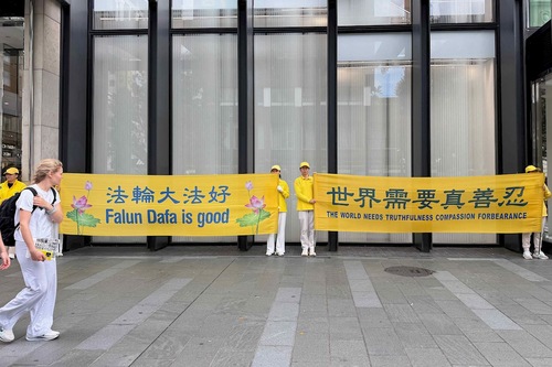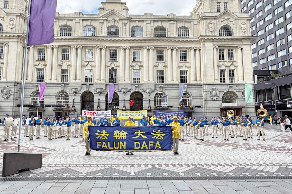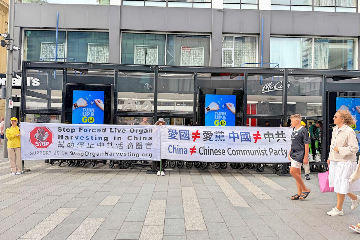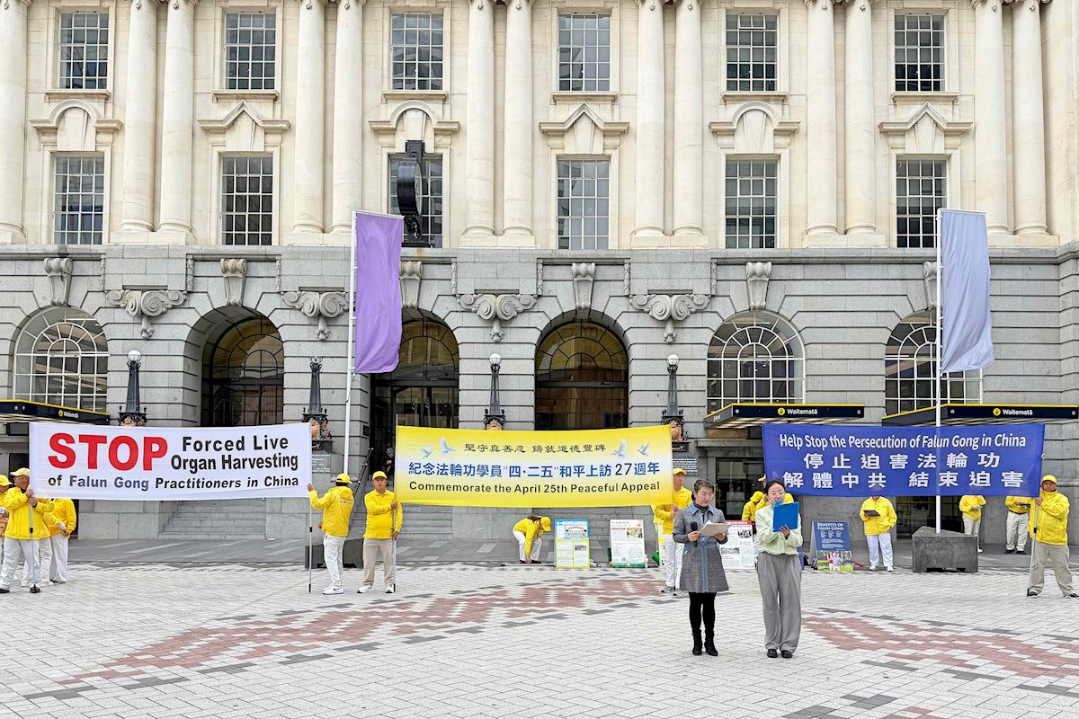 Praktykujący trzymali transparenty z wiadomościami o Falun Dafa i prześladowaniach w Chinach podczas zajęć w centrum Auckland
