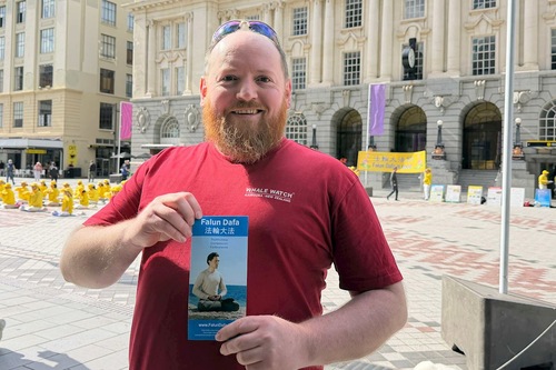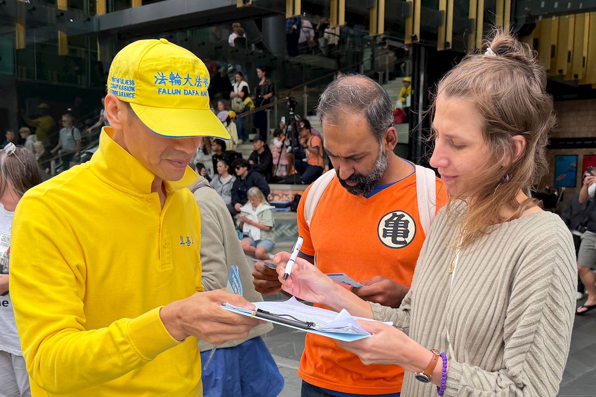 Spokojny widok praktykujących wykonujących ćwiczenia w tej ruchliwej nadmorskiej dzielnicy handlowej ukazał ludziom piękno Falun Dafa i zasady tej praktyki – Prawdę, Życzliwość, Cierpliwość. Pomogło to również zrozumieć, dlaczego praktykujący zorganizowali apel 25 kwietnia i jakie to miało znaczenie.