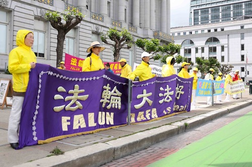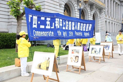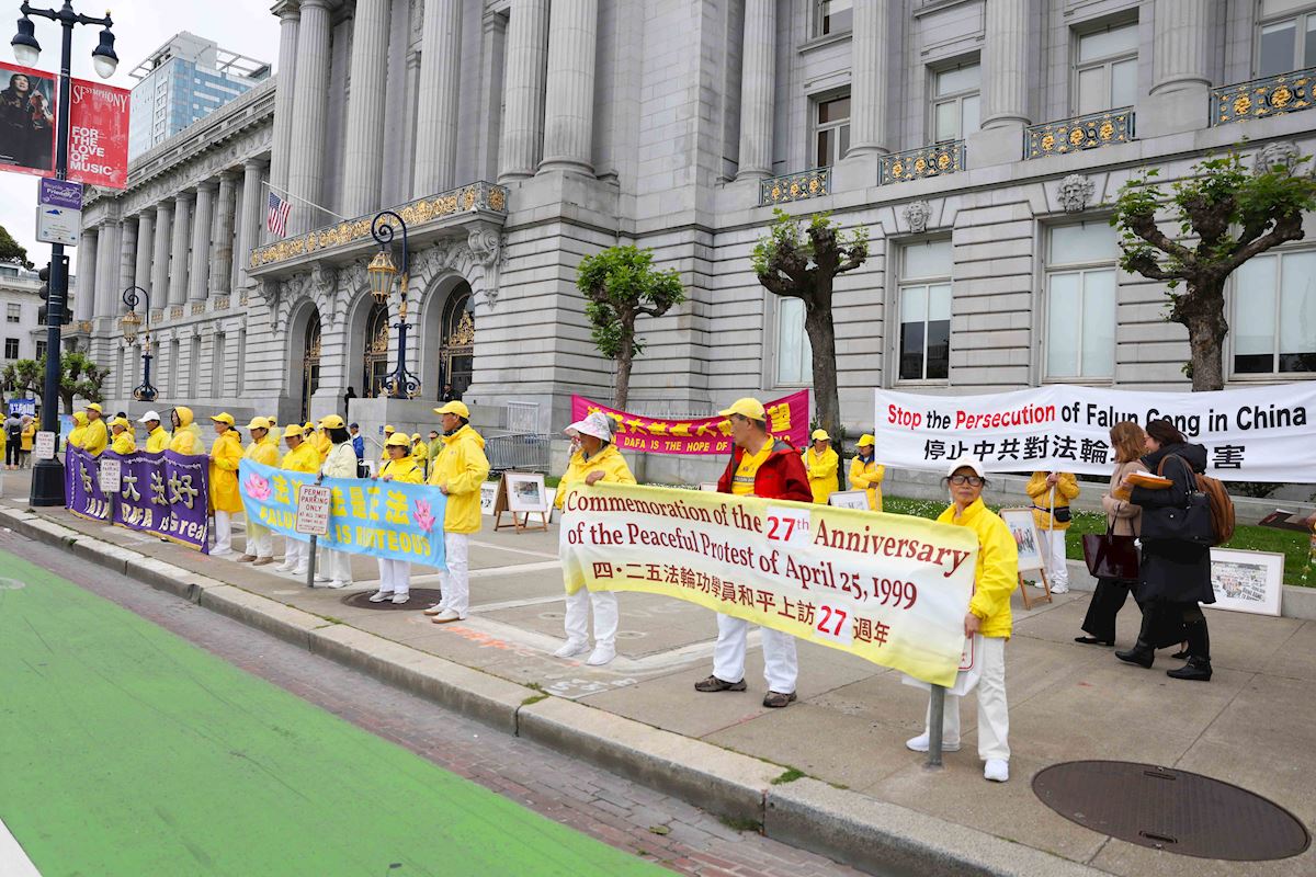 (Minghui.org) 21 kwietnia 2026 r. praktykujący Falun Gong zorganizowali wystawę zdjęć przed ratuszem w San Francisco, aby upamiętnić swoją pokojową manifestację w Pekinie, która miała miejsce 25 kwietnia 1999 r.