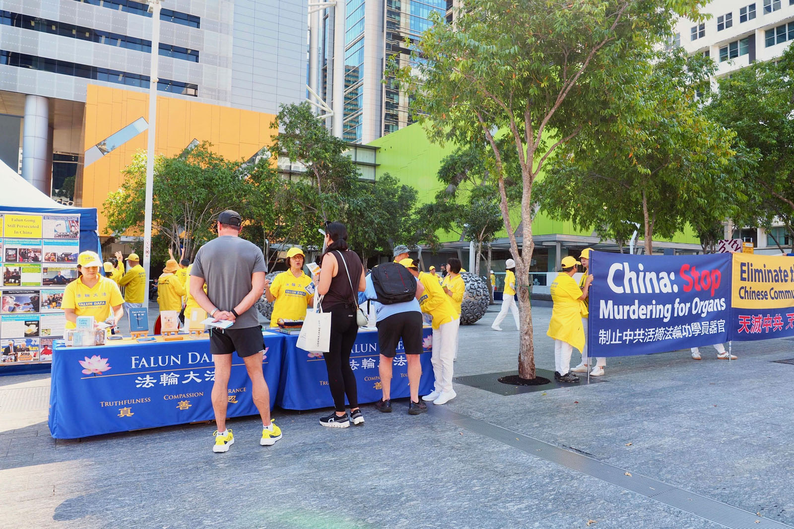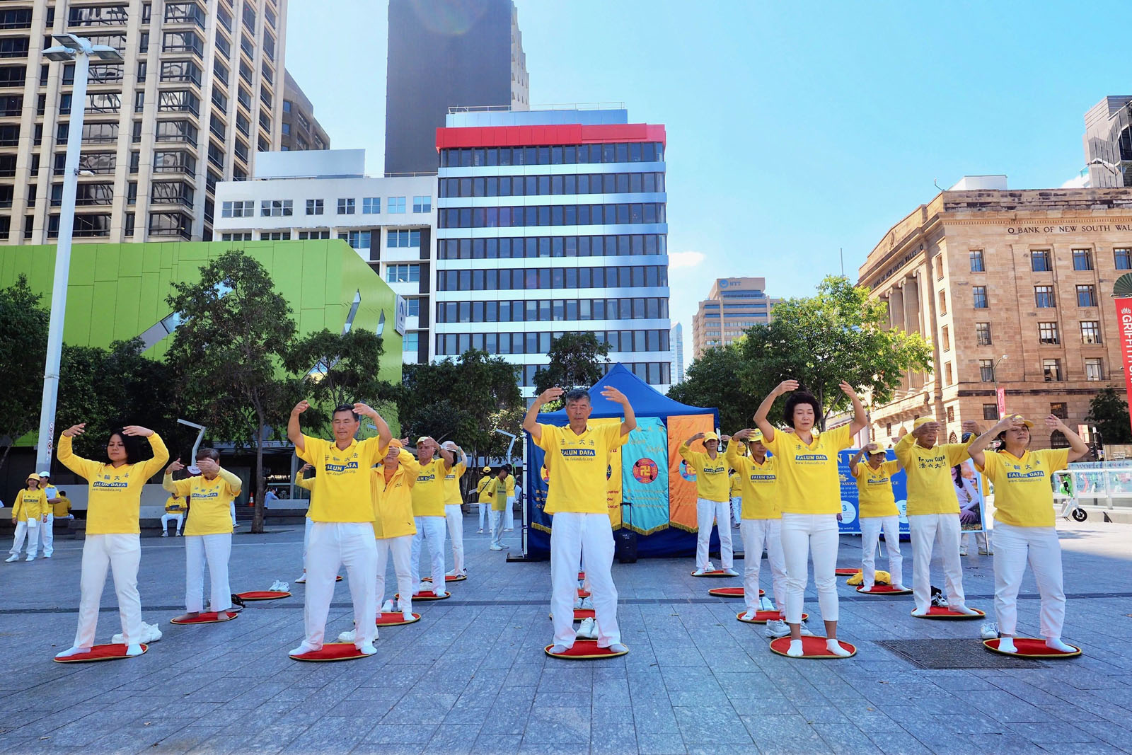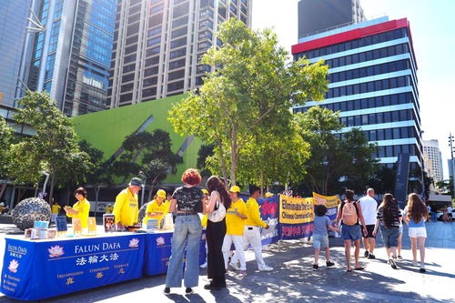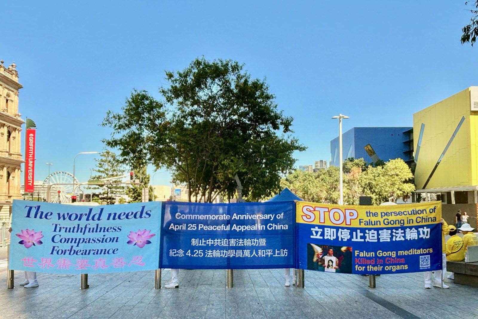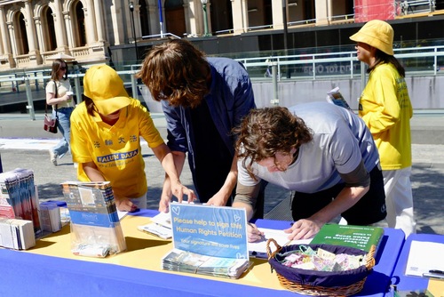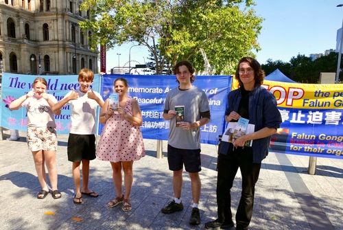 (Minghui.org) 18 kwietnia 2026 r. praktykujący zorganizowali wydarzenie na Brisbane Square, aby upamiętnić 27. rocznicę apelu z 25 kwietnia w Pekinie. Wykonywali ćwiczenia Falun Dafa, wywiesili transparenty i wyjaśniali fakty przechodniom na temat prześladowań.