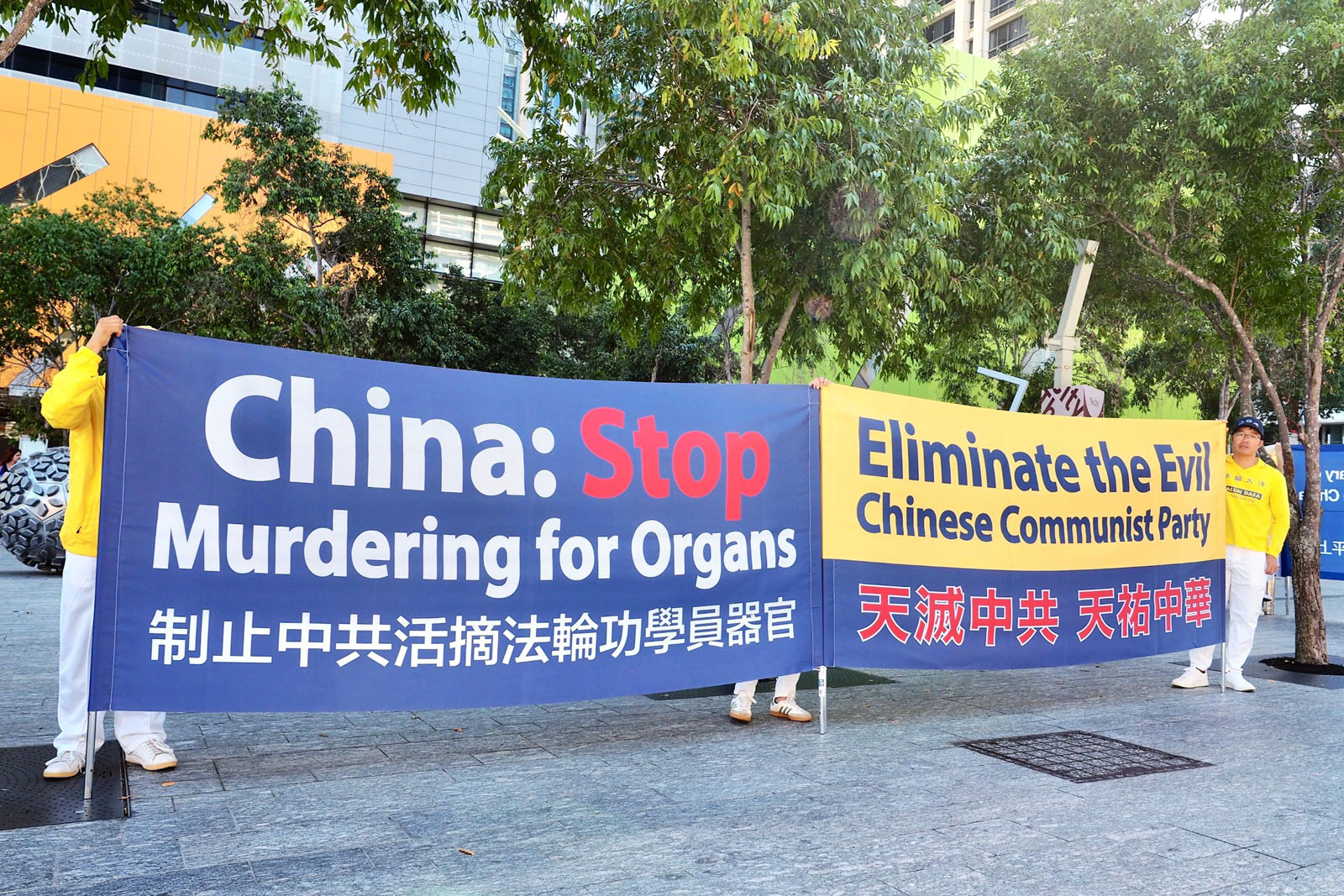 Praktykujący wywiesili banery informacyjne dotyczące prześladowań ze strony KPCh
