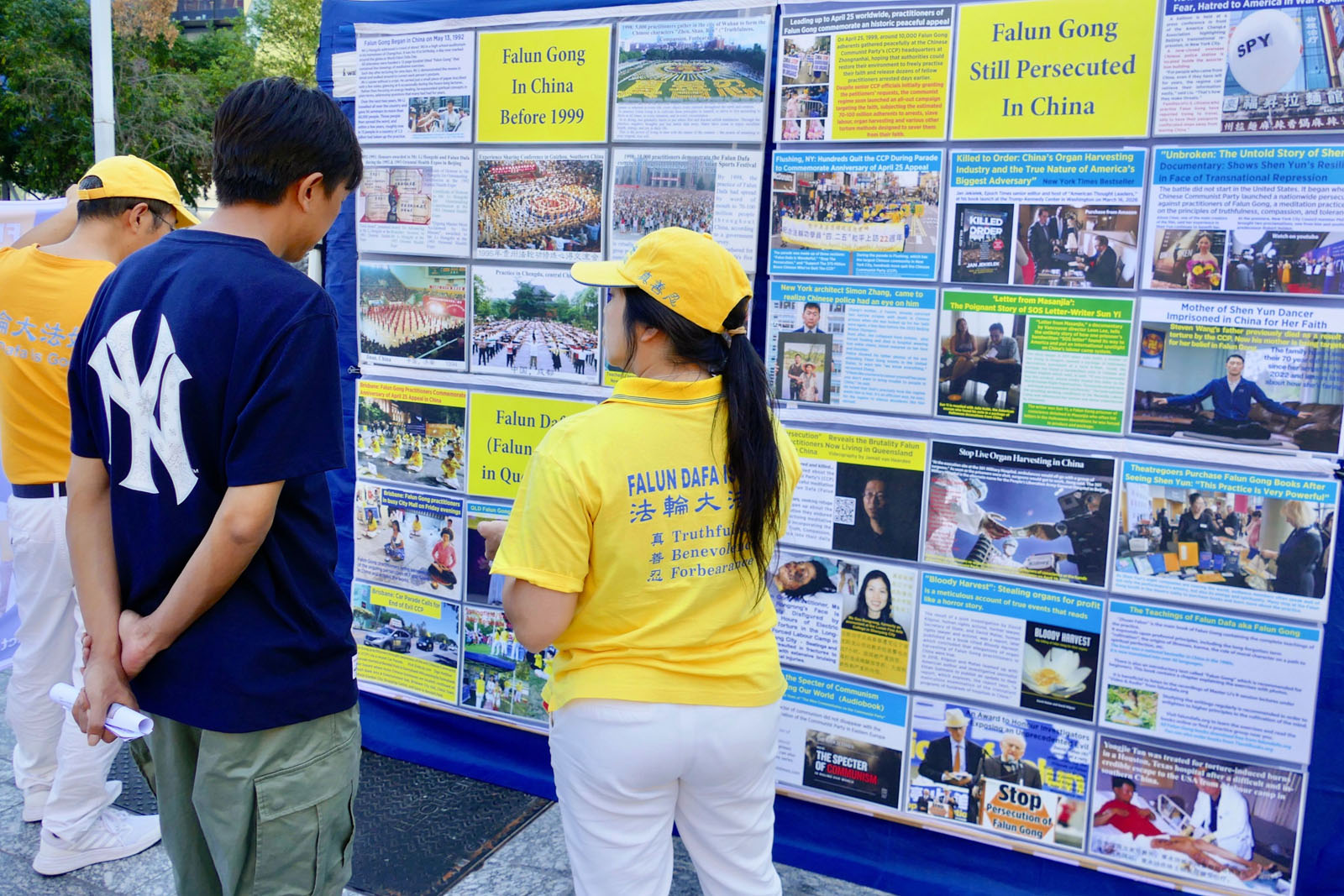 Chińska para zatrzymała się i zapoznała się z treścią tablic informacyjnych. Rozmawiali z praktykującymi i dowiedzieli się, że wydarzenie to zorganizowano dla upamiętnienia 27. rocznicy Apelu z 25 kwietnia. Tego dnia 10 000 praktykujących Falun Dafa udało się do Pekinu, aby opowiedzieć rządowi centralnemu, jakie korzyści odnieśli dzięki praktykowaniu Falun Dafa, oraz aby zażądać natychmiastowego uwolnienia nielegalnie przetrzymywanych praktykujących w Tianjin, zezwolenia na legalne wydawanie książek Falun Dafa oraz umożliwienia praktykującym Falun Dafa wykonywania ćwiczeń bez nękania.