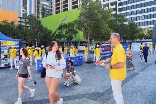 Yousef Haj Ahmad wyemigrował z Palestyny do Australii ponad 30 lat temu. Przed przejściem na emeryturę pełnił funkcję kierownika w projekcie międzynarodowej wymiany i współpracy w organizacji quasi-rządowej. Jego uwagę przyciągnęła melodyjna muzyka towarzysząca ćwiczeniom praktykujących; zapoznał się też z informacjami na temat Falun Dafa i prześladowań zamieszczonymi na tablicach informacyjnych. Chętnie przyjął ulotkę i wysłuchał wyjaśnień praktykującego na temat celu tej akcji.