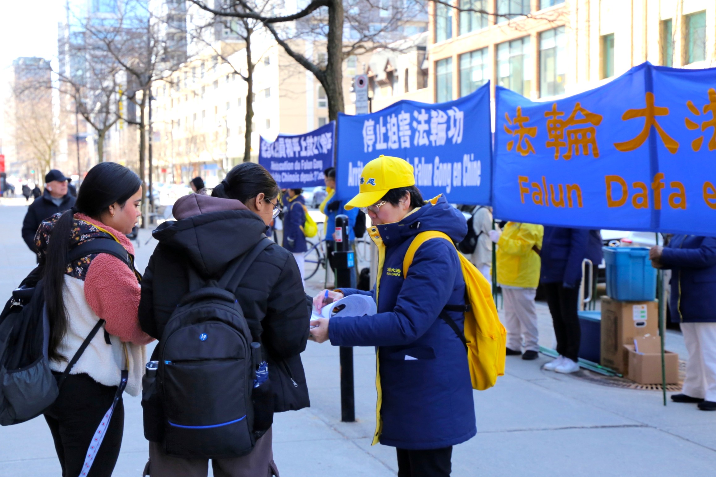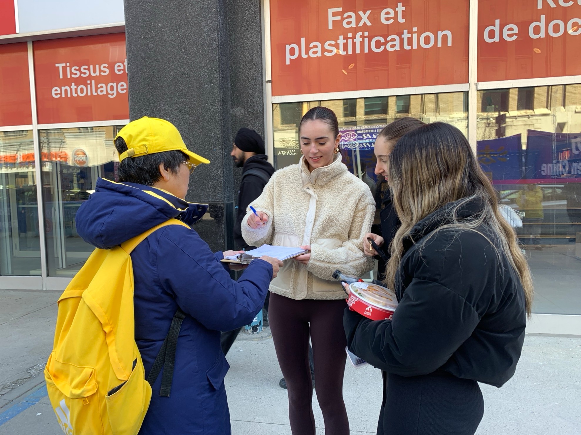 Mia, studentka, wraz ze swoją przyjaciółką podpisała petycję. Mia powiedziała: „Uważam, że ta pokojowa demonstracja jest naprawdę piękna. Wszyscy stali w ciszy, trzymając transparenty i rozdając ulotki, i opowiadali nam o prześladowaniach. Przekazaliście swoje przesłanie w sposób budzący prawdziwy szacunek. Mam szczerą nadzieję, że więcej osób zwróci uwagę na tę sprawę i zdecyduje się podpisać petycję, aby was wesprzeć”.