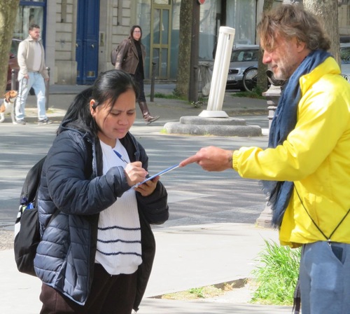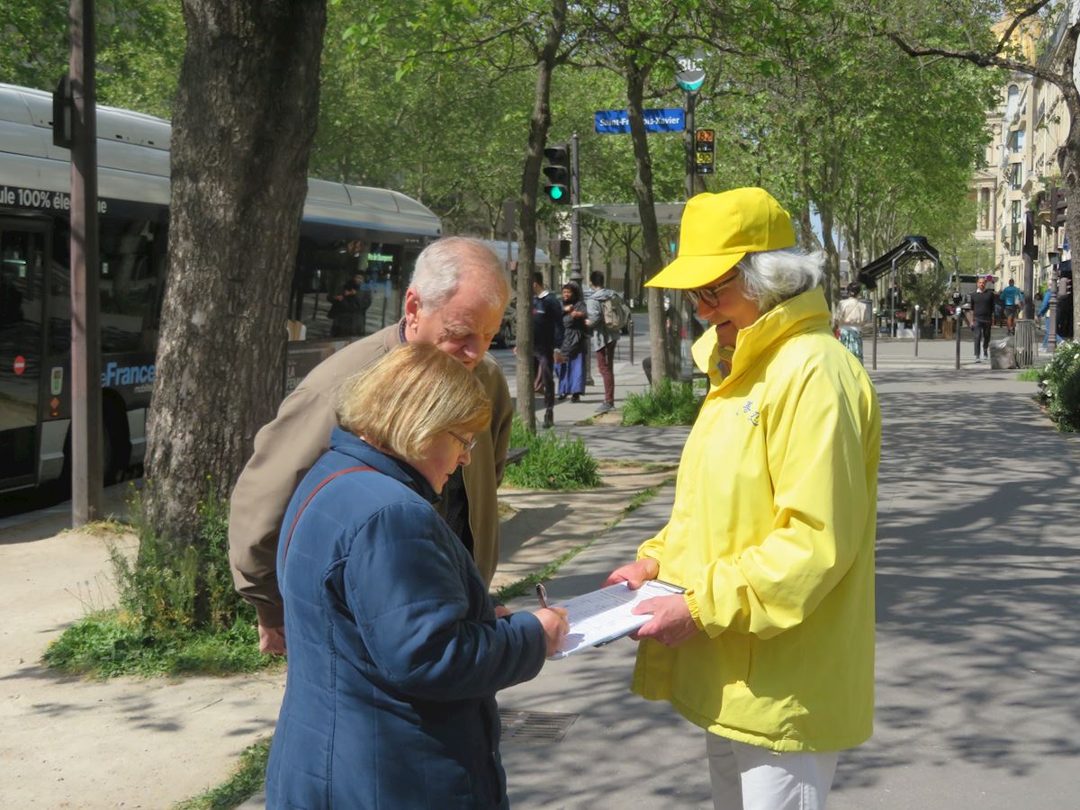 Wiele osób zatrzymało się, aby obserwować praktykujących demonstrujących ćwiczenia w pobliżu wejścia do metra. Praktykujący opowiedzieli im o znaczeniu Apelu z 25 Kwietnia. Ludzie wyrazili swoje poparcie i życzenia oraz podpisali petycję wzywającą do zakończenia prześladowań.