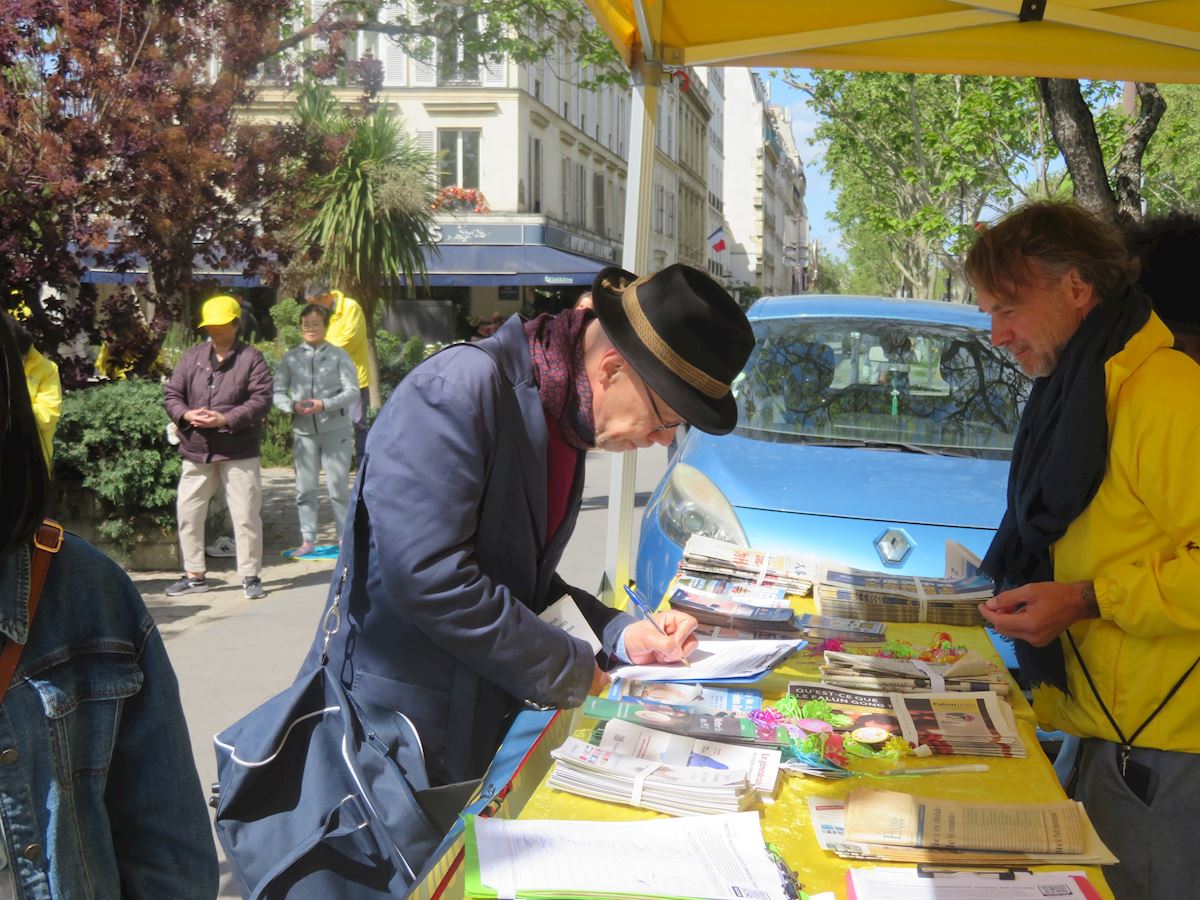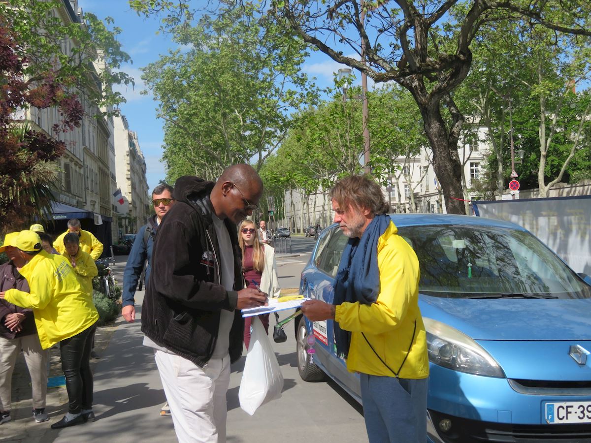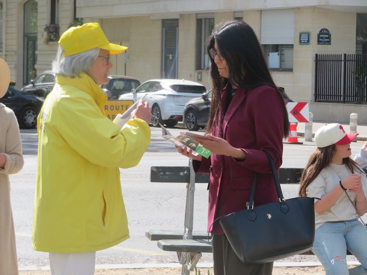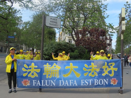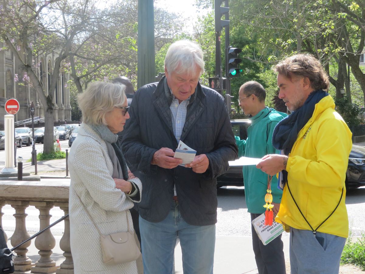 (Minghui.org) Praktykujący zorganizowali wydarzenia na placu André Tardieu 20 kwietnia 2026 roku, aby upamiętnić swój pokojowy apel w Pekinie z 25 kwietnia 1999 roku. Mieszkańcy i turyści dowiedzieli się o korzyściach płynących z praktykowania Falun Dafa i o tym, jak Komunistyczna Partia Chin (KPCh) nadal prześladuje tę duchową dyscyplinę, w tym pobiera organy od praktykujących za życia.