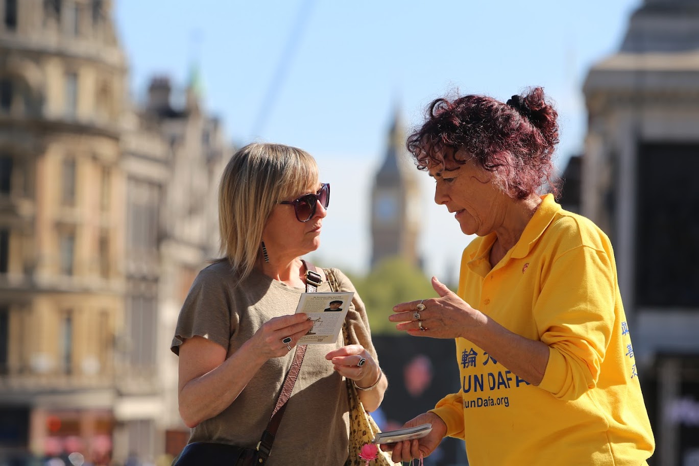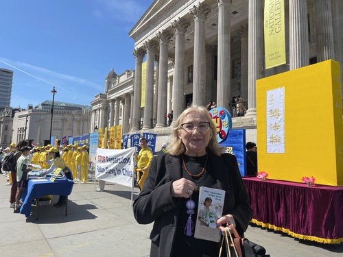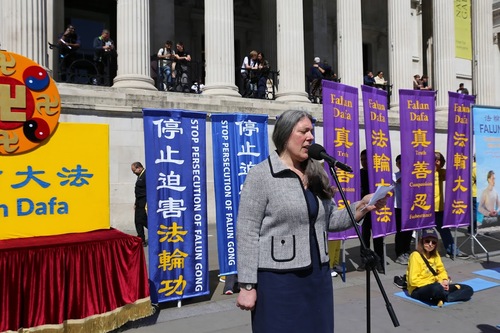 Caroline, reprezentująca Brytyjskie Stowarzyszenie Falun Dafa, zwróciła uwagę: „Prześladowania mają miejsce nie tylko w Chinach – Komunistyczna Partia Chin (KPCh) wyciągnęła swoje czarne macki na wszystkie zakątki świata. Również w Anglii doświadczamy transgranicznych represji ze strony KPCh, w tym propagandy mającej na celu pranie mózgu, napaści fizycznych, a nawet groźby ataków bombowych”. W swoim przemówieniu jasno określiła cel dzisiejszych działań: „Całkowicie powstrzymać tę masakrę i przemoc, które od tak dawna ogarniają Chiny”.