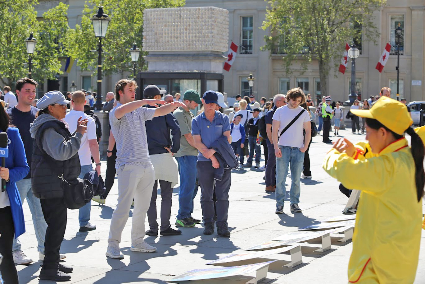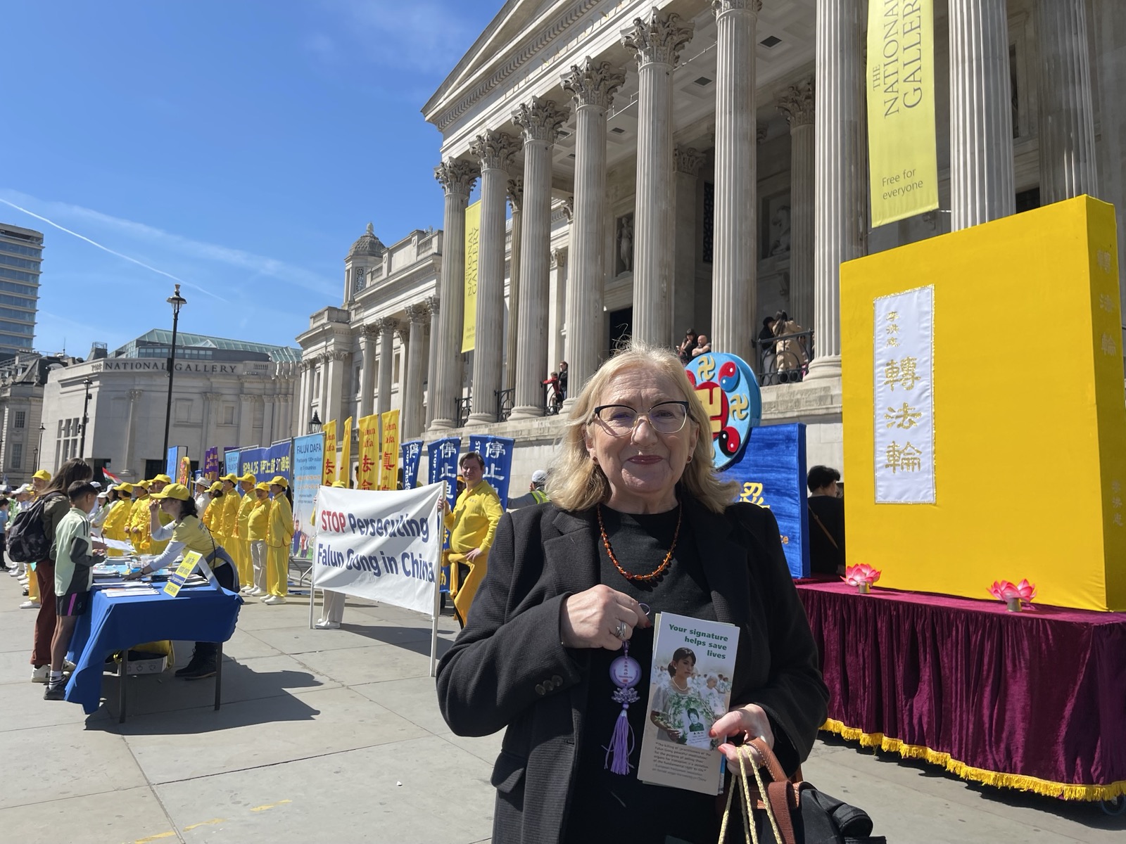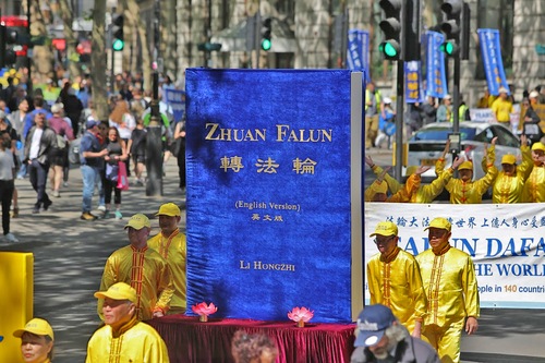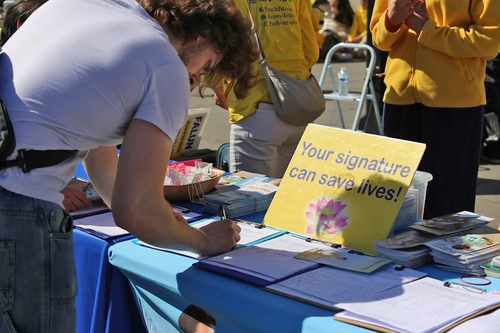 Wiele osób zatrzymywało się, aby popatrzeć, robić zdjęcia i nagrywać filmy. Przyjmowali ulotki rozdawane przez praktykujących i podpisywali petycję wzywającą do zaprzestania prześladowań Falun Gong w Chinach.