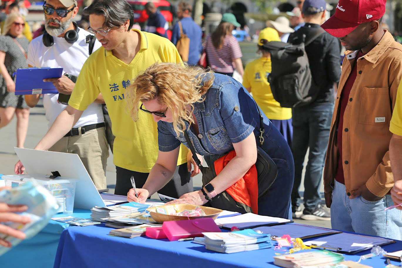 Przechodnie podpisują petycję wzywającą do zaprzestania łamania praw człowieka wobec praktykujących Falun Gong