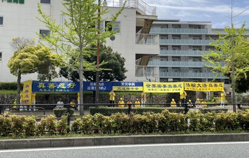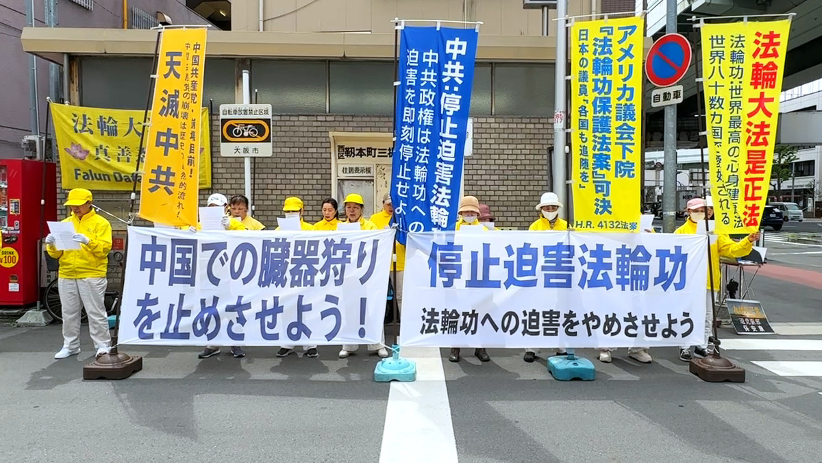 Praktykujący z regionu Kansai zebrali się 21 kwietnia przed chińskim konsulatem w Osace. Wywiesili transparenty i wezwali KPCh do natychmiastowego zaprzestania prześladowań Falun Gong i pobierania narządów od żyjących praktykujących.